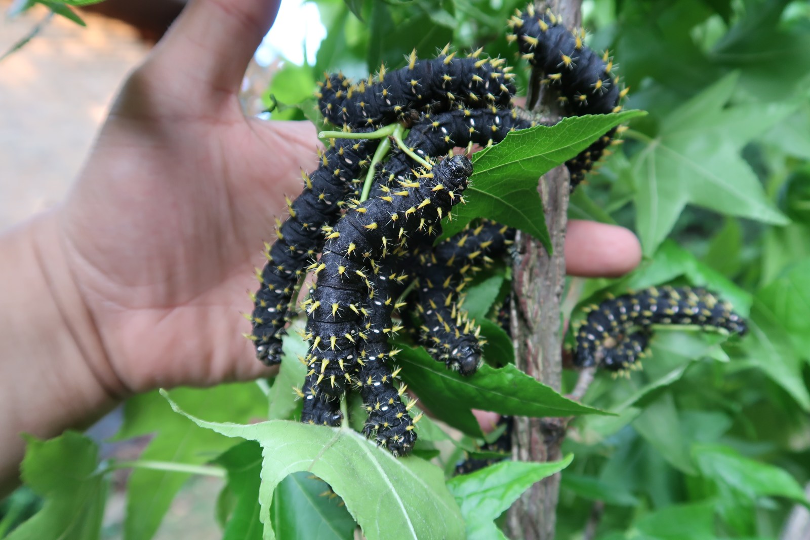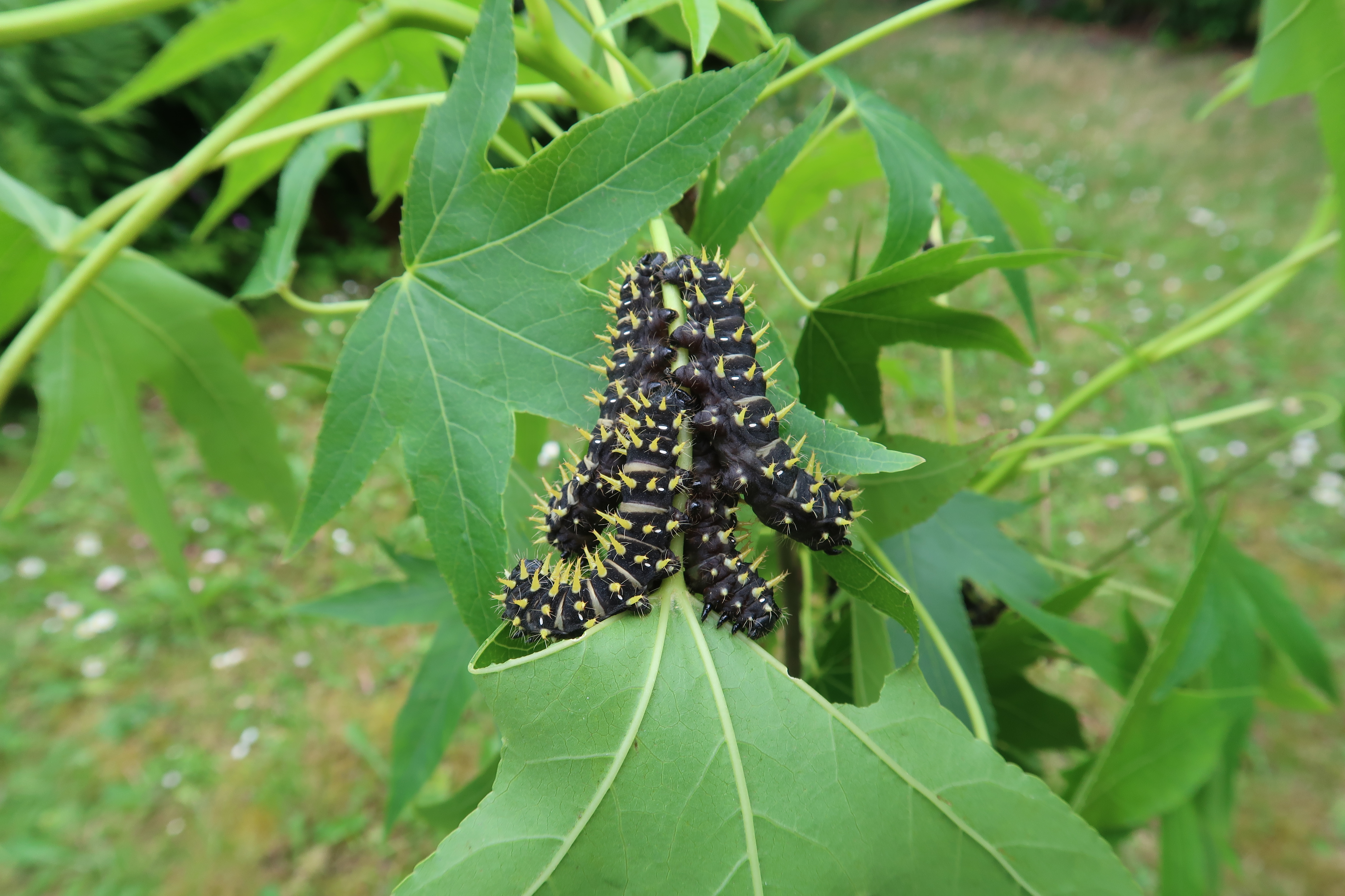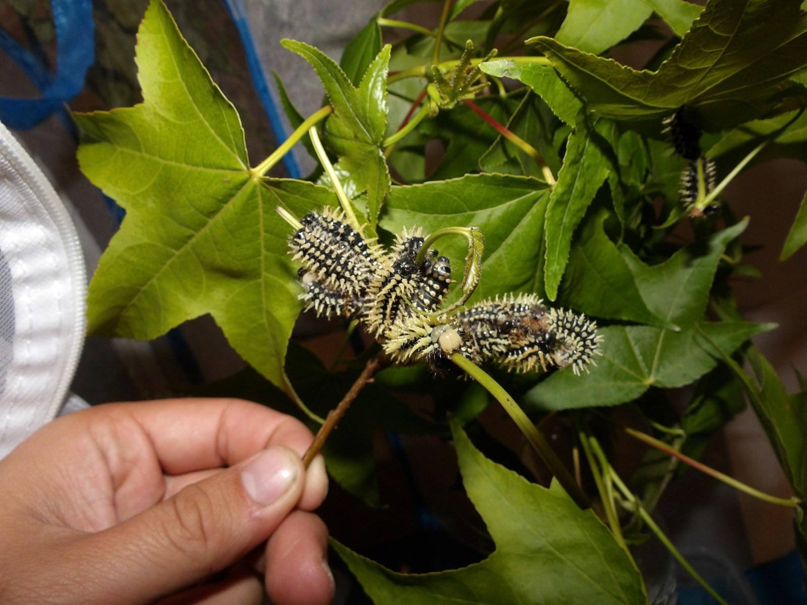 After the first three instars, the caterpillars become more interesting looking; they are now black with edgy yellow spikes. From L4 and beyond it is perhaps adviseable to move them into cages or sleeves, preferably well-ventilated ones.