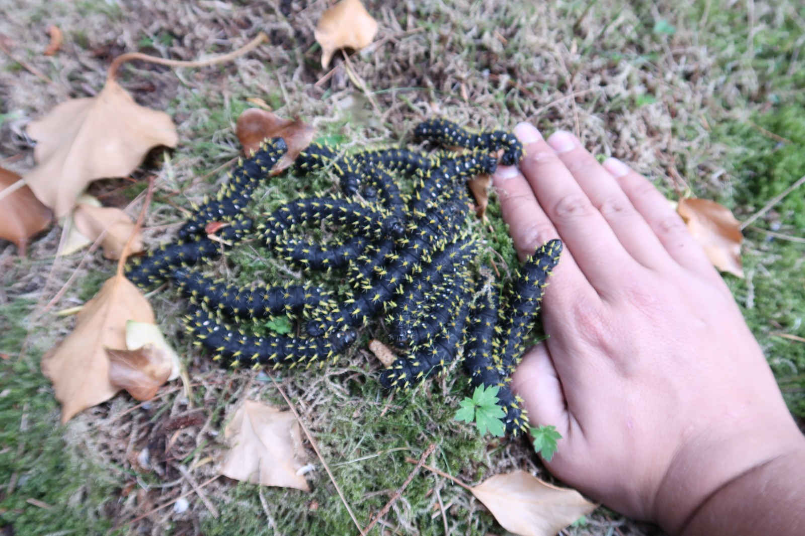 The caterpillars of Nudaurelia dione are very social. They travel, eat and rest in groups, and it is only in the final instar that they become a bit solitary. They are also very beautiful: the caterpillars have a black cuticle that contrast with their bright yellow spines and white spiracula. Despite being silkmoths, this species does not spin a cocoon, and caterpillars burrow into the soil in order to pupate underground (as it typical of most Bunaeini). After pairing, females deposit 50 to 150 creamy white/yellow eggs that hatch after about 21 days. This species is easy to breed in captivity, if you have basic experience with silkmoths.