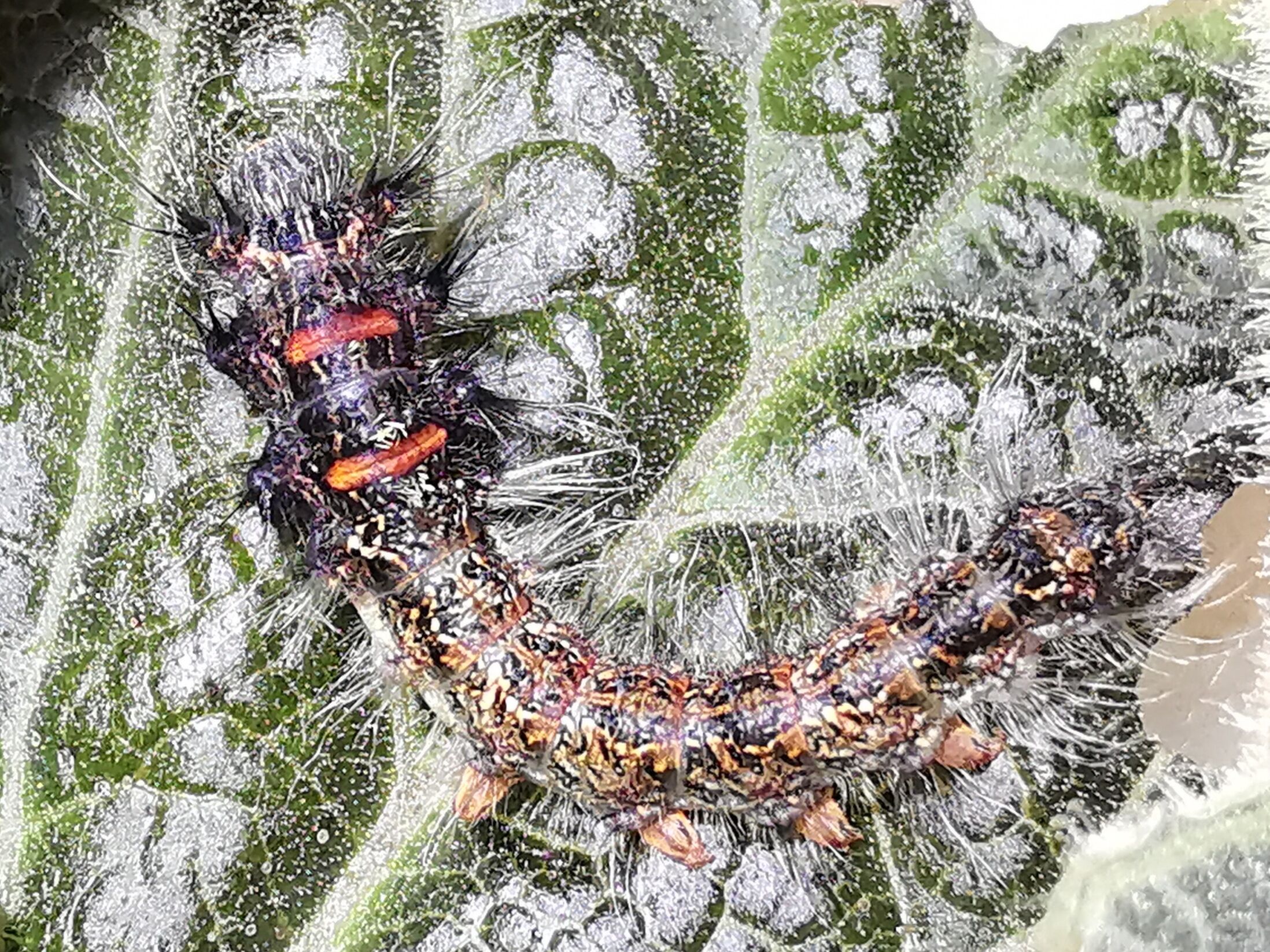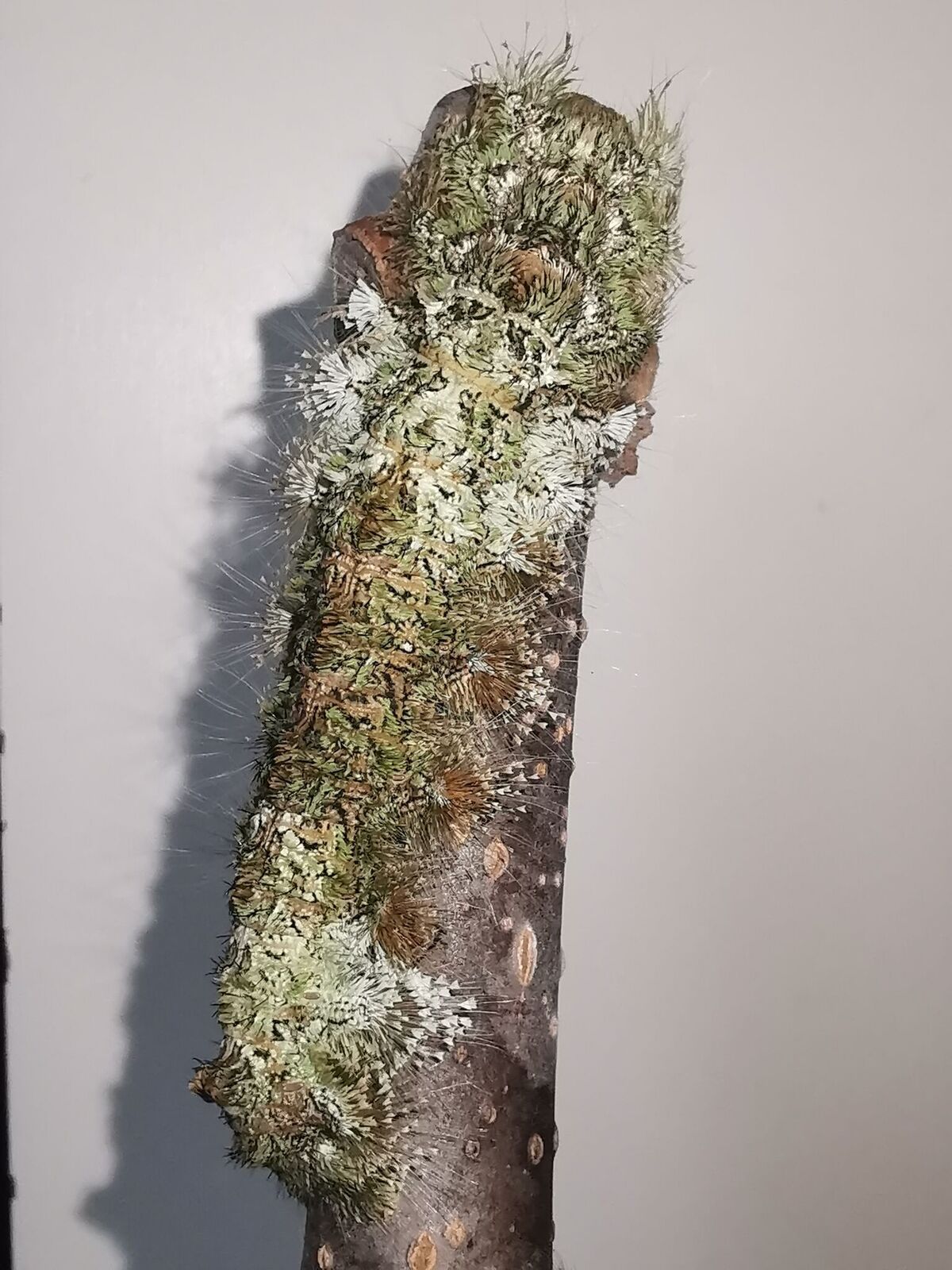 The camouflage of these larvae is helped by the structure of the ‘hairs’. These modified structures have flattenned areas which lay flat and break up the lines of hairs, creating a perfect match for lichens and tree barks.