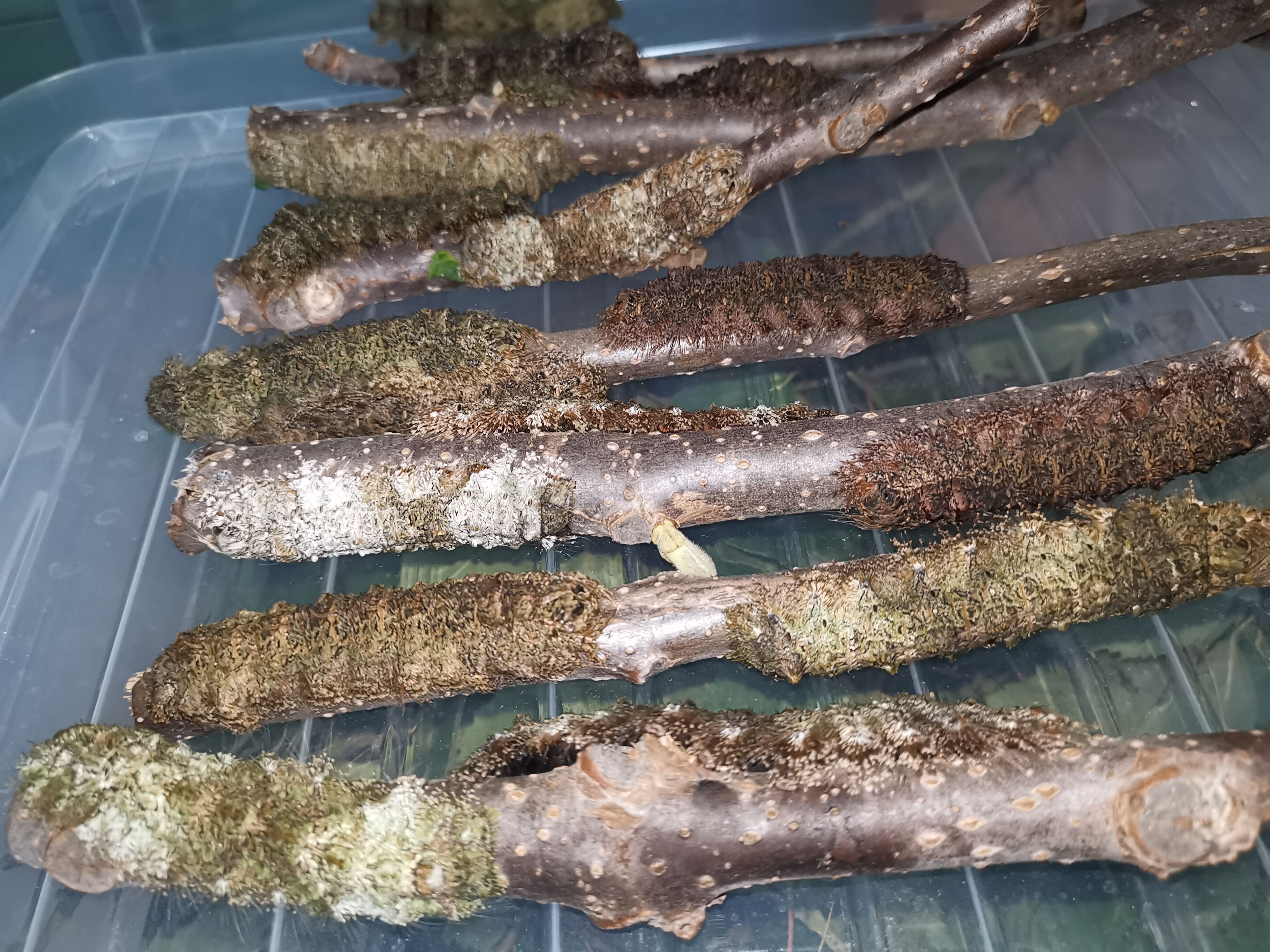 The larvae would often rest on tissue which was used to improve cleanliness. I presume that they detected the woody fibres and texture of the tissue as resembling tree bark. For this reason, it is advisable to place a network of sticks across the bottom of the cage. This provides places for the larvae to take up their natural resting positions, without spending time in amongst their frass. Tissue should be avoided, as it encourages the larvae to return to the floor, where health is at risk. At the L5 instar, the larvae started to develop small black spines criss-crossing along their back amongst the finer hairs.