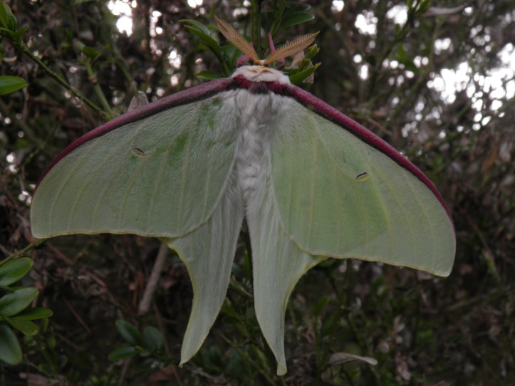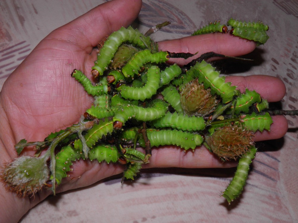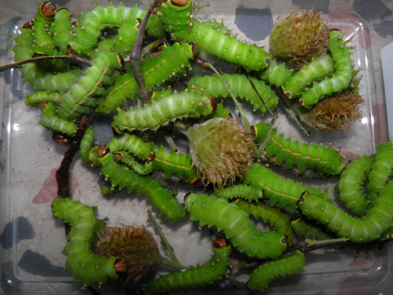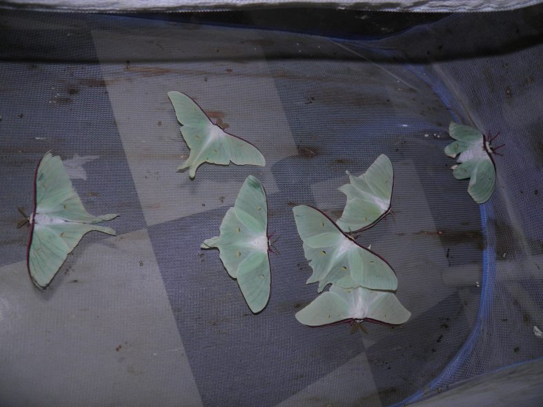 The caterpillars of Actias dulcinea are easily raised in captivity on various host plants if you remember the basics of breeding any type of Saturniidae; keep clean, ventilated, don’t get overconfident and overcrowd them and provide fresh and well hydrated food. The first three instars can be raised in plastic containers, bigger larvae need a well ventilaged cage, sleeve or box with the lid removed for fresh air.
