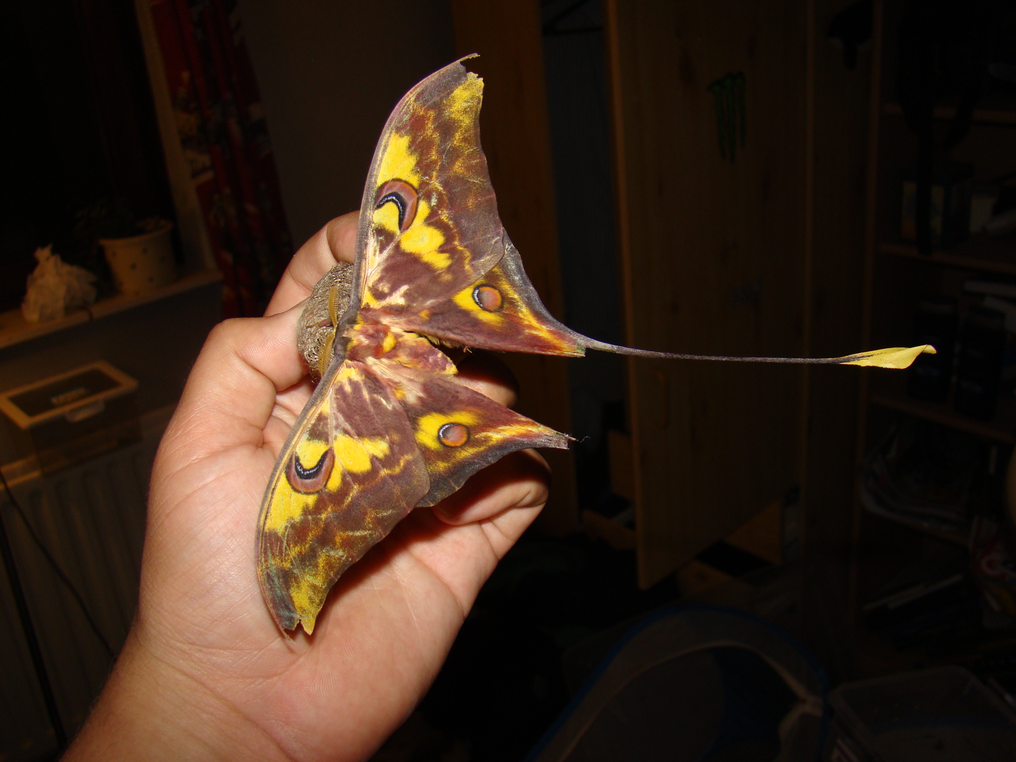 Unfortunately, males of this species do not last up to their full potential as they are very hyperactive and frantic flier and will become worn out, “ugly” and damaged within a few days of emerging from their cocoons. The long tails which are very fragile, are often broken when the animals are handled due to them dropping themselves on the floor and flopping around as a defensive mechanism. However it also happens naturally as the moths fly a lot. This is not only an “aesthetic” problem: most ugly moths do not care, and are able to fly and pair with no problems. However in the case of A. isis, they can damage themselves quickly to the degree where it becomes impossible for them to pair with a female. Not only will they damage their wings, but they can also quickly lose ‘feet’ on their legs (their claws, or rather tarsal claws). Without tarsi, the moths have no grip on any surface and cannot climb to reach females. In some cases, their antennae are partially destroyed too hindering their senses they need to locate a female, an wings can be damaged to the point that it impairs their ability to fly.