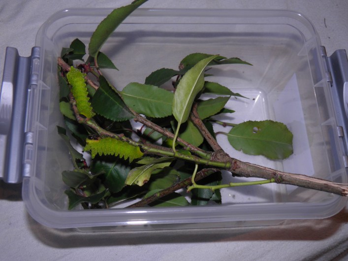 This setup would be a big “no-no” for the majority of silkmoths; Actias isis however copes just fine with being raised in plastic containers.