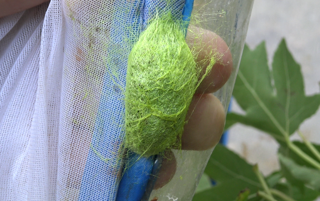 The freshly spun cocoons of Actias sinensis are flourescent green! However, in the span of mere days, they dry up and harden, and turn silvery brown. The cocoons are typically spun in the middle of leaves that envelop (and hide) them effectively, although in captivity, larvae often also choose to spin cocoons in the corners of their cages.