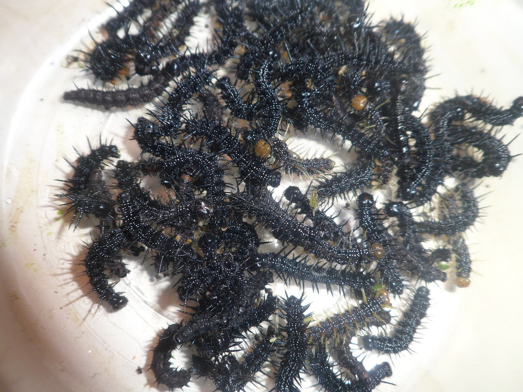 The peacock butterfly is a common occurrence in the largest part of Europe.. Their caterpillars feed exclusively on Urtica (stinging nettle). They are quite easy to rear. The young caterpillars live communally and can be found in large clusters containing hundreds of individuals. These “nests” consists of silken threads spun over the host plant like a web.
