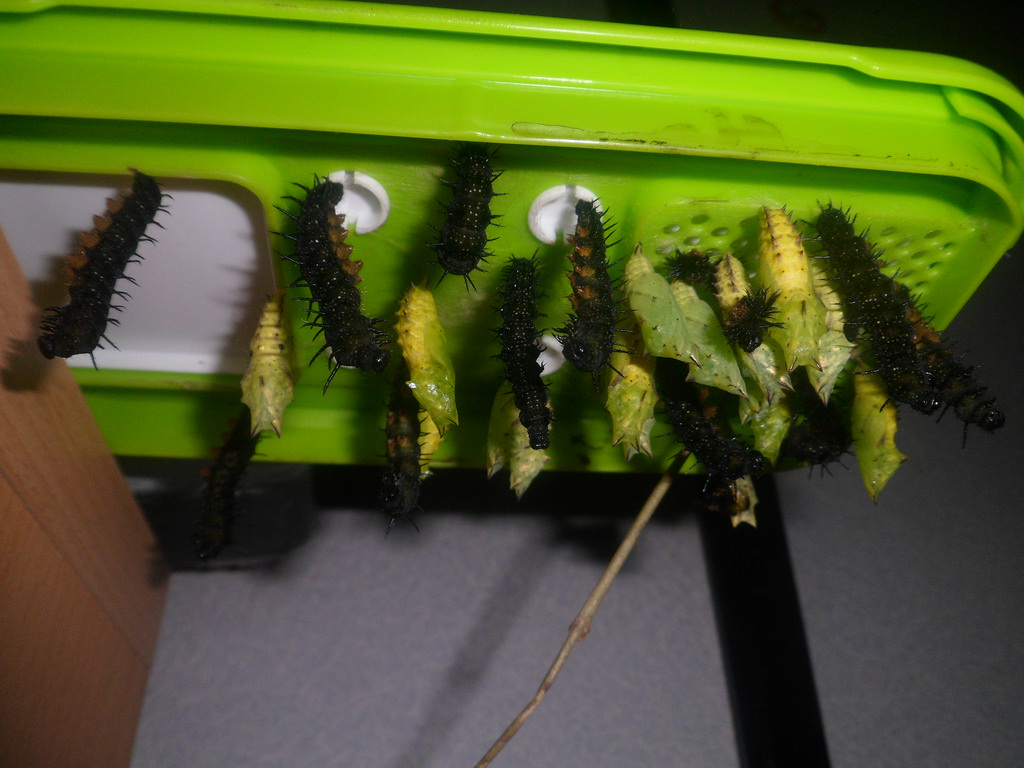 When growing larger, the caterpillars become a bit more solitary, and spread out over the foliage. They can however still be reared in higher densities and are quite tolerant of eachother. Like most Nyphalids, Aglais io caterpillars pupate while hanging upside down, anchored to a silk padding.