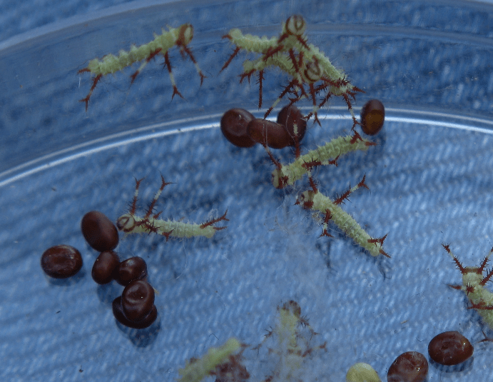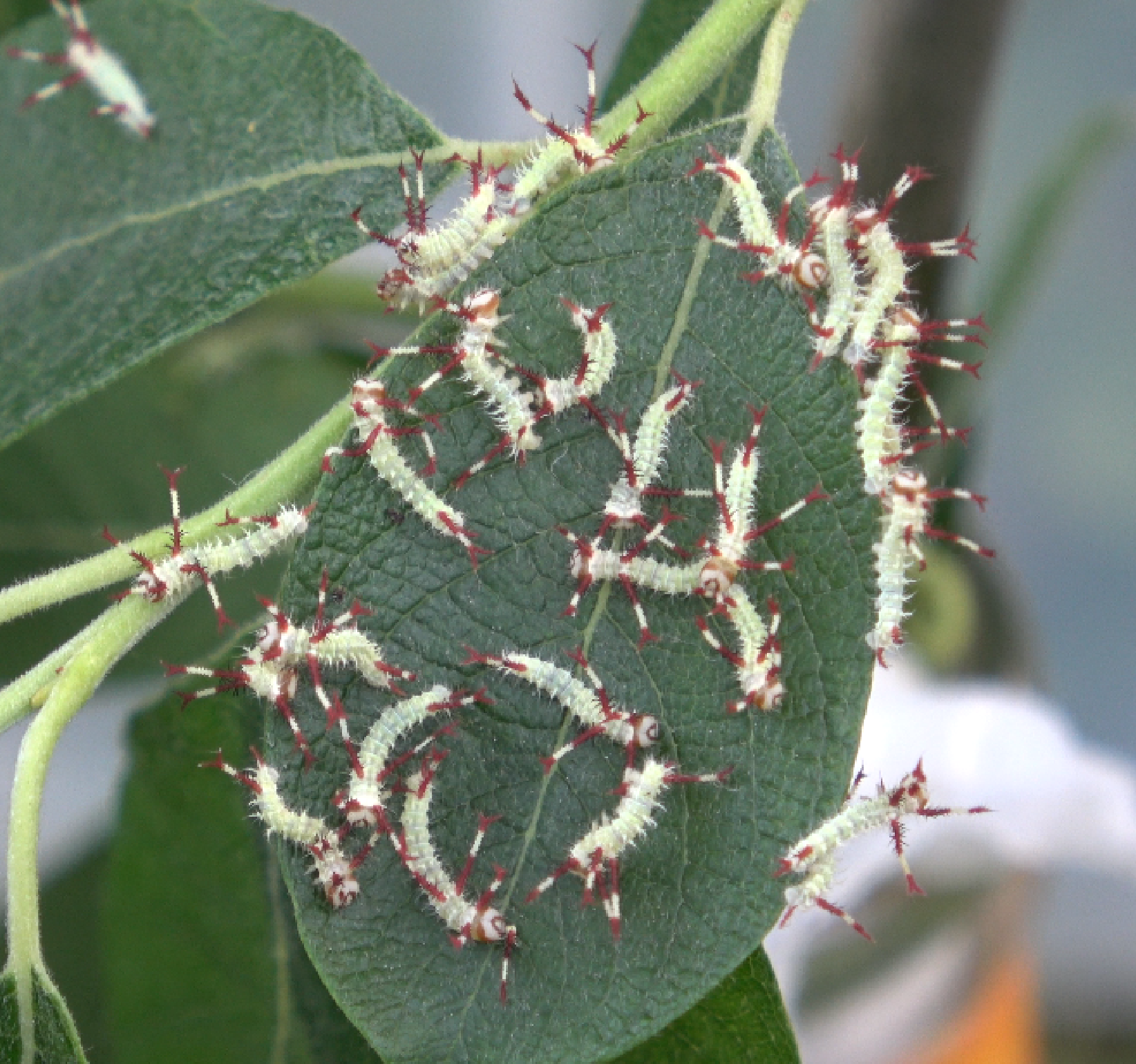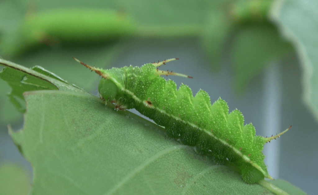 The first and second instars have large red and white ‘antlers’. The third instar has more creamy brown/yellowish spines that point forwards and backwards.