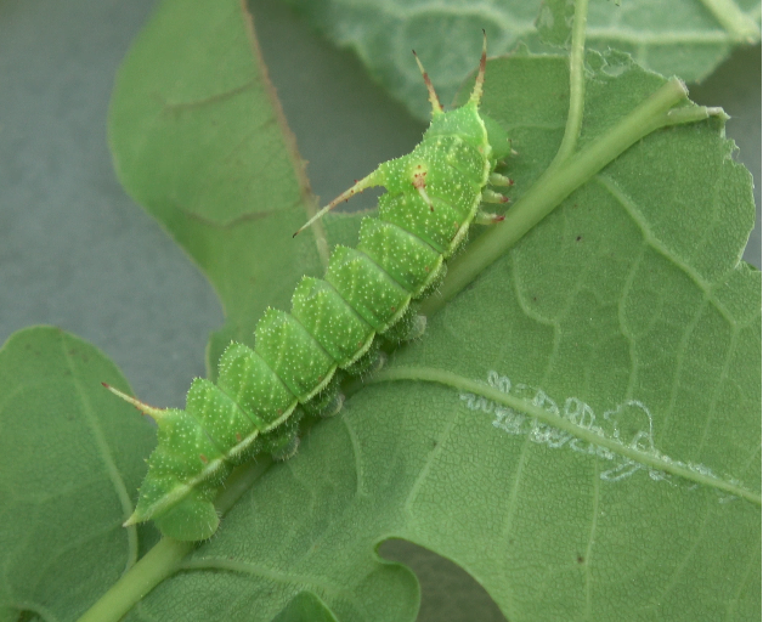 The final, and fourth instar is naked! The final life stages loses these iconic appendages. Fully grown larvae appear to have countershading; the bottom half is darker green while the top half is more bright, lime green. The larvae also have white speckles, and orange spiracles. The spiracle behind the last thorarical segment has a bright red-orange spot that surrounds it. A creamy white band runs along the body. Fully grown larvae tend to be near 4.5cm to 6cm in size (male larvae smaller).