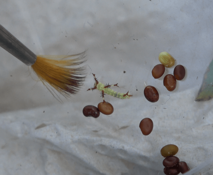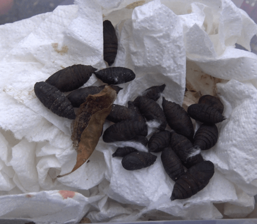 - Difficulty rating: Moderate – Not a super difficult species to breed; but the caterpillars are sensitive to the right amount of humidity. Too wet, or too dry, and they don’t seem to thrive. A slightly humid but ventilated enclosure is key, so that excess moisture can evaporate from the container. Don’t overcrowd them. Rearing larvae is the only challenging part; pupal care and pairing the adults is incredibly easy.