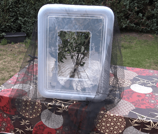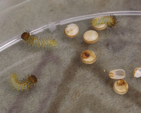 The first instar(s) can be reared in plastic boxes, with cut food plant in water bttles to keep it fresh. Although this species seems to dislike stuffy and too humid conditions, it seems to be O.K for the first two instars. Make sure you do not overcrowd them and replace the food for fresh leaves every few days!