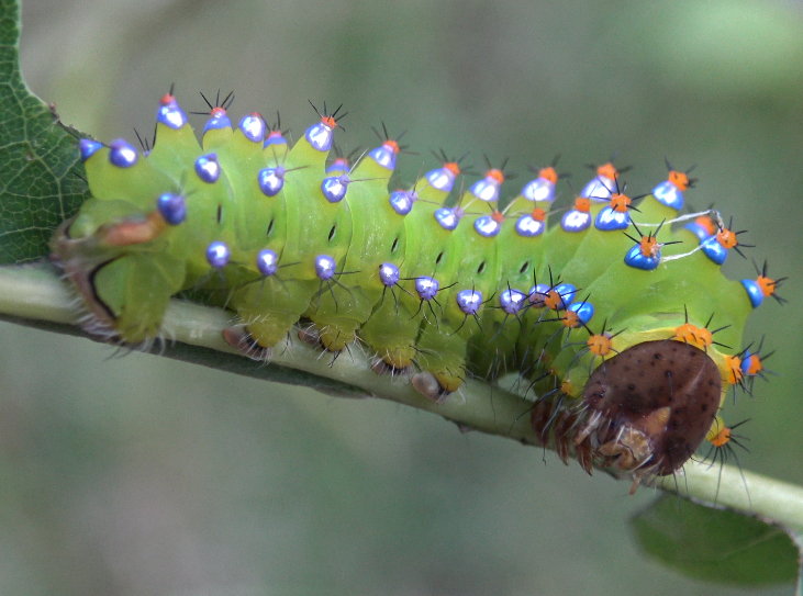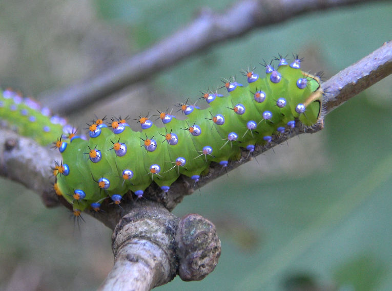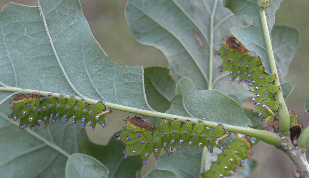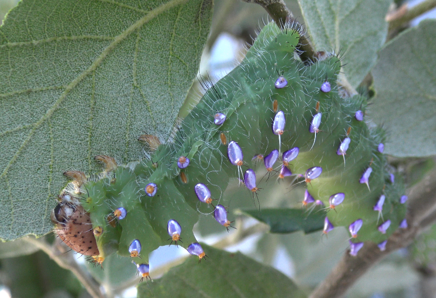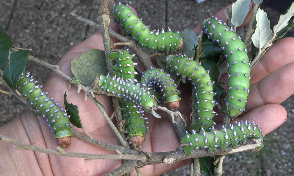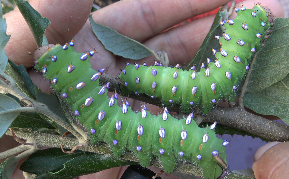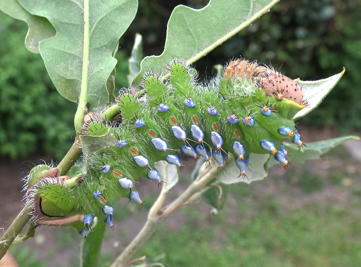 Just as spectacular as the moths, are their larvae. The caterpillars have highly iridescent pink/metallic patches. They appear to be well-adapted to dry and warm conditions, and feed on evergreen and semi-evergreen species of oak tree, that in some cases, have though and dry leaves.