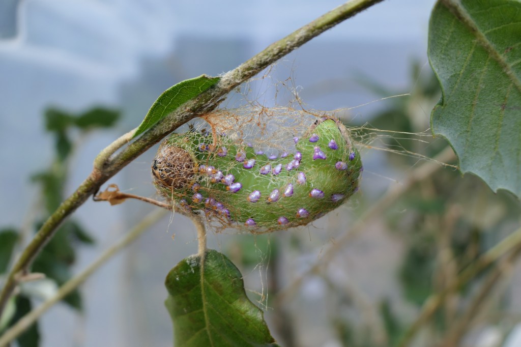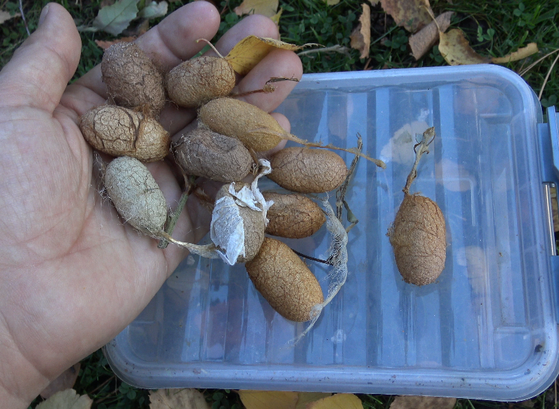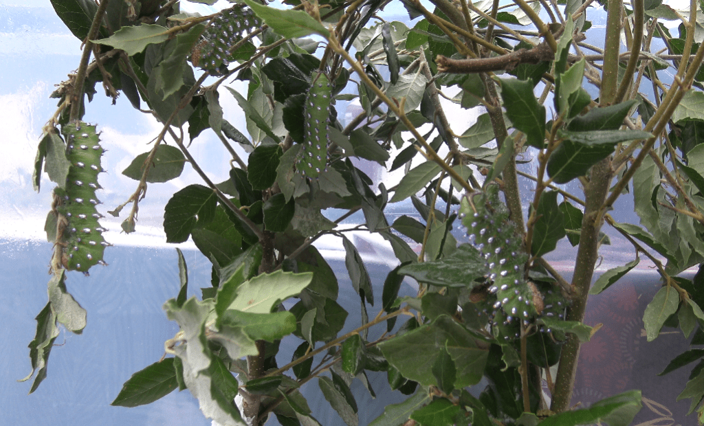 However, if you’ve done it properly – they will begin spinning cocoons. The cocoons are oval, and attached to the host plant with a silk pad.