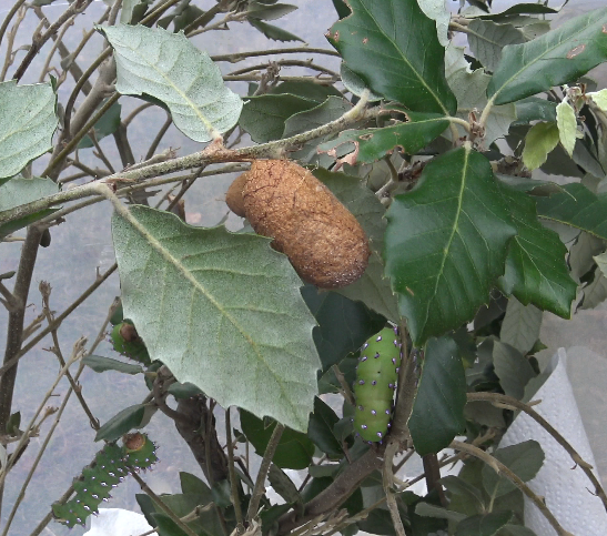 - Special notes: The biggest challenge lies in rearing the larvae; in captivity, the cocoons and the moths are easy to take care of. The caterpillars, however, can be somewhat sensitive. They prefer to be on the more warm and dry side, it seems. Too much humidity can make the larvae sick and result in infections. They also prefer evergreen oak tree with hard and dry leaves; I had good result with Quercus ilex and Quercus suber, despite them being non-native food plants. Suprisingly, I had worse results with Quercus robur and Quercus rubra (in most Saturniidae it’s the opposite – they struggle to feed on the dry and hard leaves of evergreen oak; but Antheraea montezuma is well adapted to them it seems).