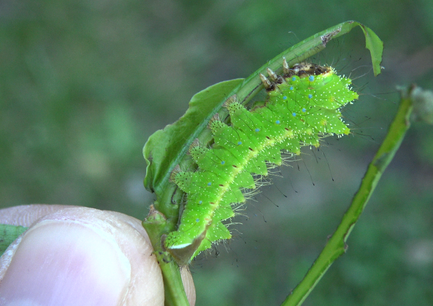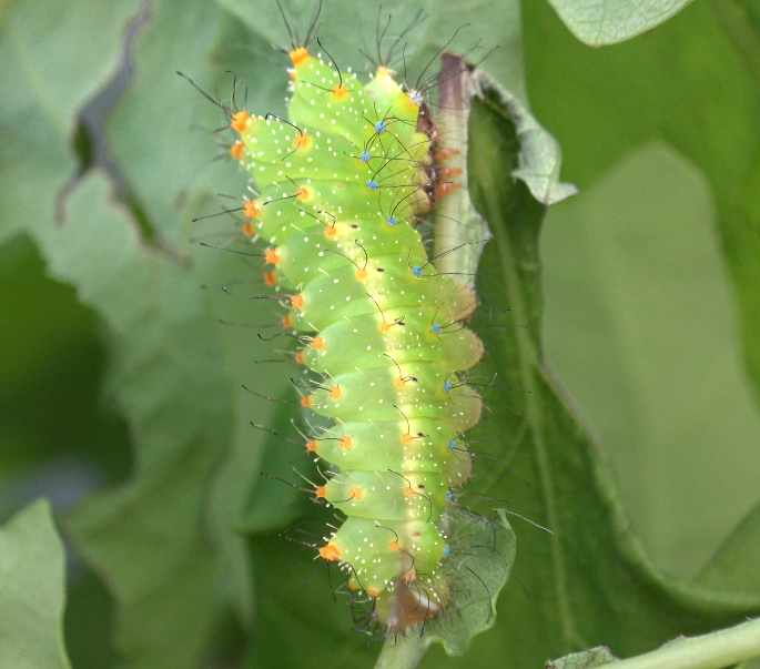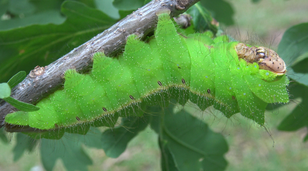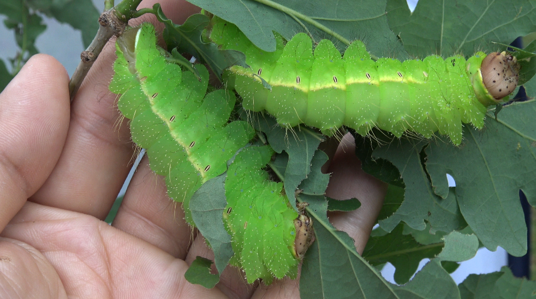 The larvae of Antheraea pernyi are rather chubby, with a brown head capsule that exihibits ‘freckle’ like spots, an almost fluorescent lime-green ground colour, and a creamy white stripe that runs along their flank. Larvae also have thin, long dark hairs. In captivity, these moths can be raised on dozens of plants – but it prefers oak tree (Quercus sp.) by far – hence the common name, Chinese Oak Silkmoth, and oak tree is recommended for optimal breeding.