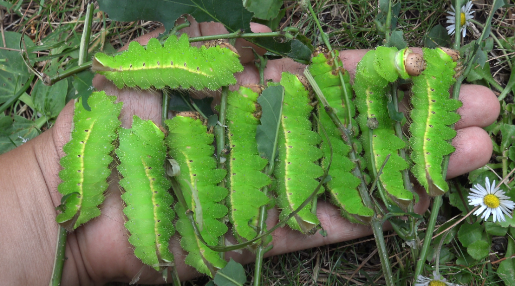 And now, things accelerate! The two last life stages of Antheraea pernyi will thrive in cages, between 19C-28C. They have a large biomass and become quite plump. Please enjoy some pictures of these large, fully grown caterpillars!