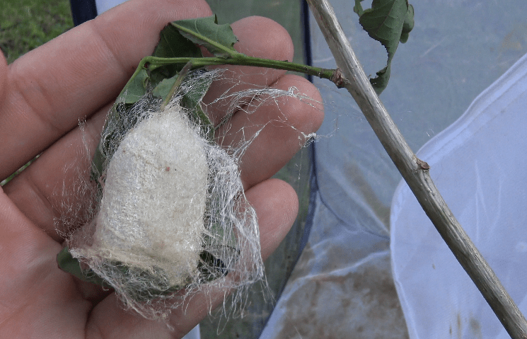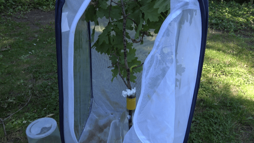 A typical setup for Saturniidae includes a bottle or empty can filled with water – and cuttings of a desired host plant – inside a pop up cage for insects. The water will allow the plant and it’s leaves to stay fresh for several days, so that the larvae will be able to feed on it for a prolonged amount of time!