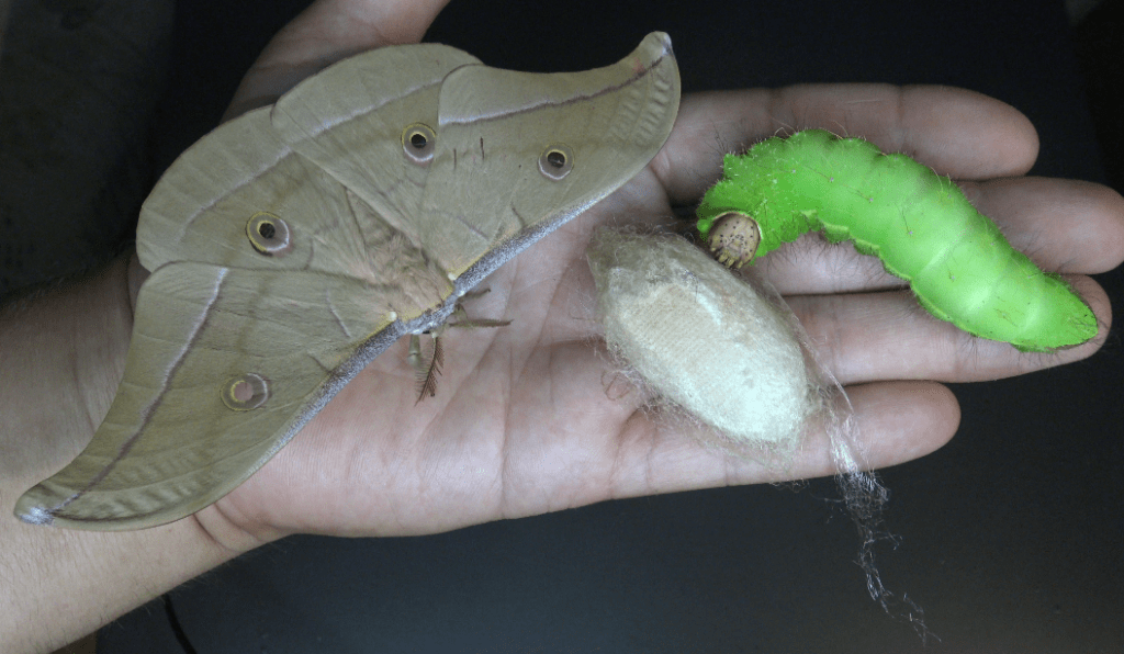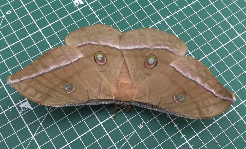 That’s right! Antheraea pernyi is a domesticated animal. Which is a suprising fact not many people realise; it’s origins are rather human. It’s thought to originate from China, but is also found in Taiwan, was introduced by humans to Japan, then was introduced by humans in Korea, the Amur region in Russia, and yes, even parts of Europe – in this case Spain and the island of Mallorca. As you can see, it lives in the temperate parts of the world, and the species is able to hibernate and survive cold winters. The species was domesticated for silk production; it’s considered to be a commercial species of silkmoth. [One of the most prominent pieces of information I could find on the internet, was a scientific paper titled “Diverse evidence that Antheraea pernyi (Lepidoptera: Saturniidae) is entirely of sericultural origin.” Published in 2012 by Doctor Richard Peigler, in Tropical Lepidoptera Research] .