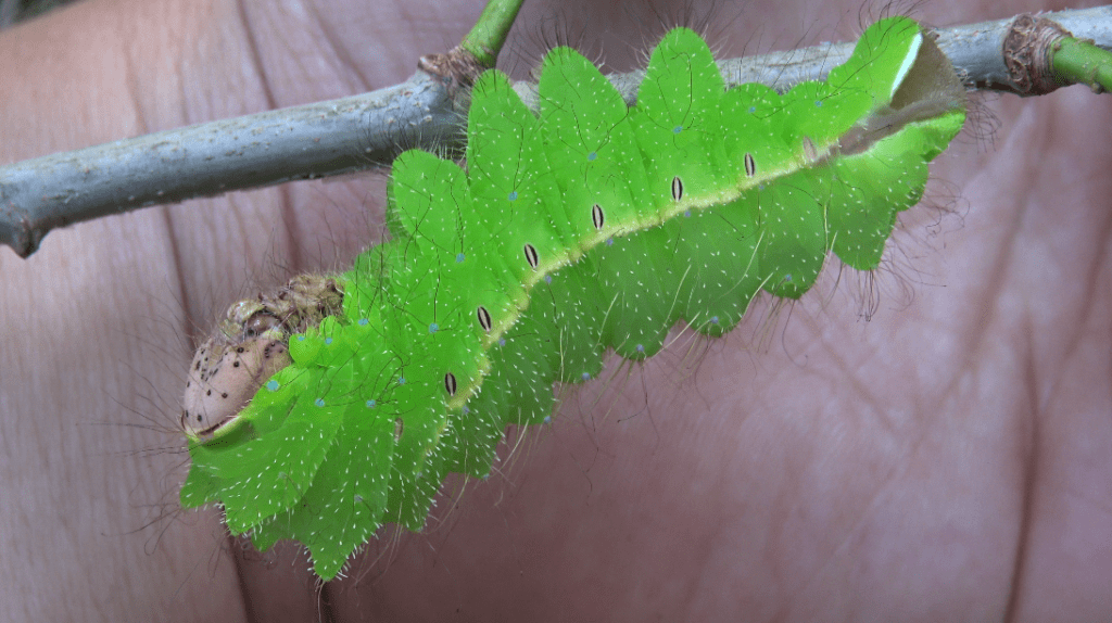 The fourth and fifth instar of Antheraea pernyi look quite similar; the main difference is their size; otherwise their appearance is almost the same. In L4, the caterpillars develop a face full of – what looks like – freckles! In very rare cases, the larvae can have yellow and orange forms.