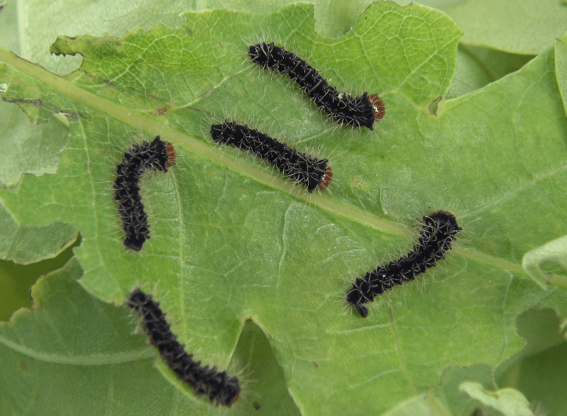 For L1 and L2 plastic boxes work fine if kept clean! Replace food with fresh leaves every few days and remove frass. After feeding for several days, larvae shed their skins – the second life stage is green, with yellow tubercules.