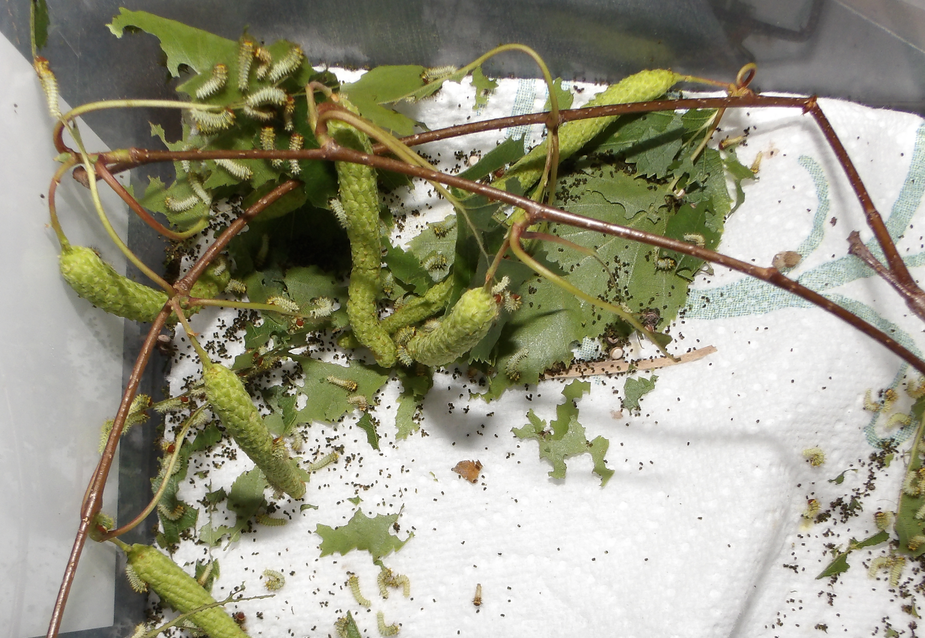 The baby caterpillars are easily raised in plastic boxes. Important is that they are not kept too humid (leaves evaporate water), but to combat this, they can be given a substrate of water absorbant paper towels, or given small ventilation holes. Not adding too much leaves also helps keep the humidity down. A few great host plant options are oak (Quercus), birch (Betula), willow (Salix) and sweetgum (Liquidambar) for good result and nicely sized specimens, but any of the host plants mentioned before can work. Experimentation with food plants can give different and perhaps interesting results.