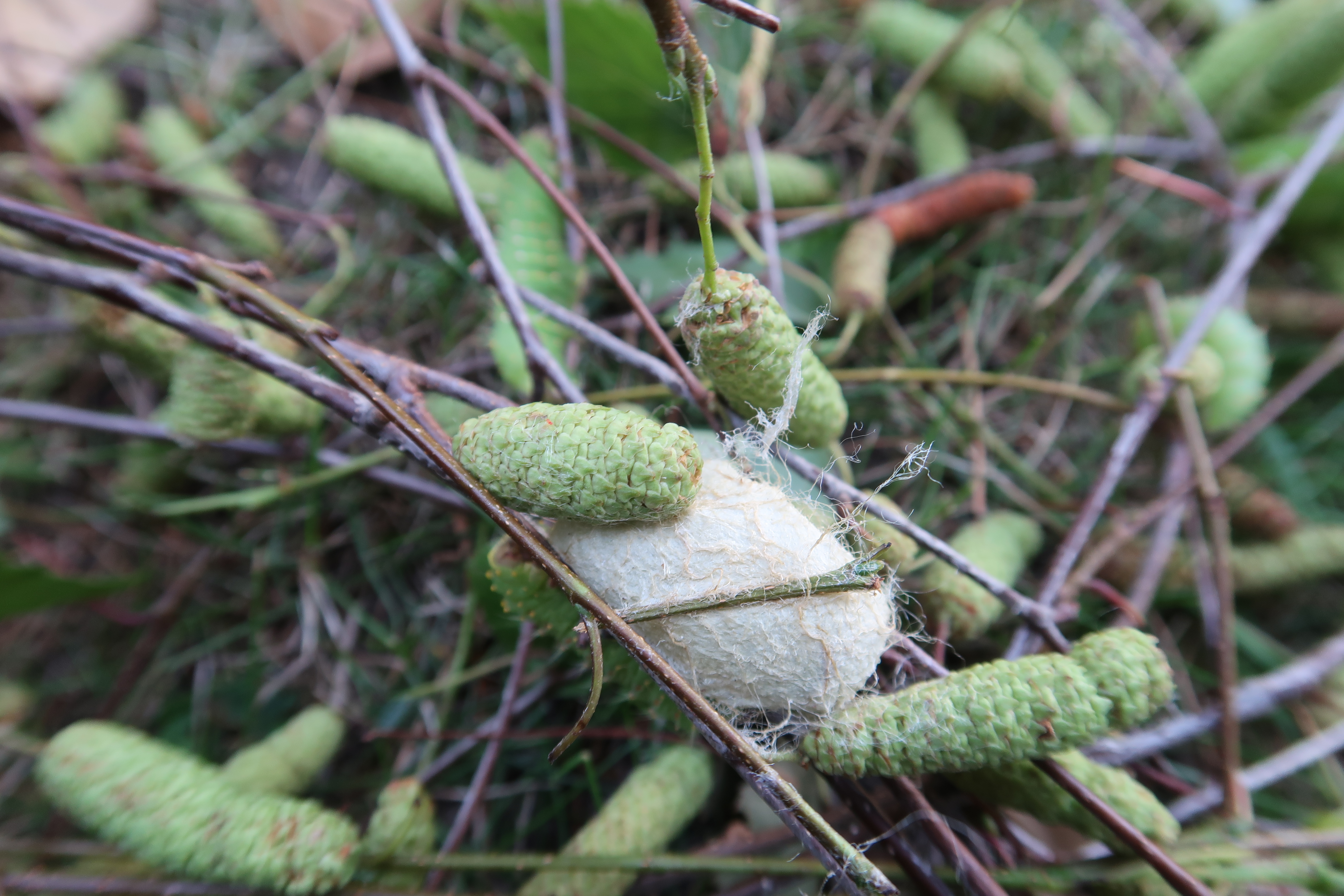 Antheraea polyphemus cocoon between birch twigs
