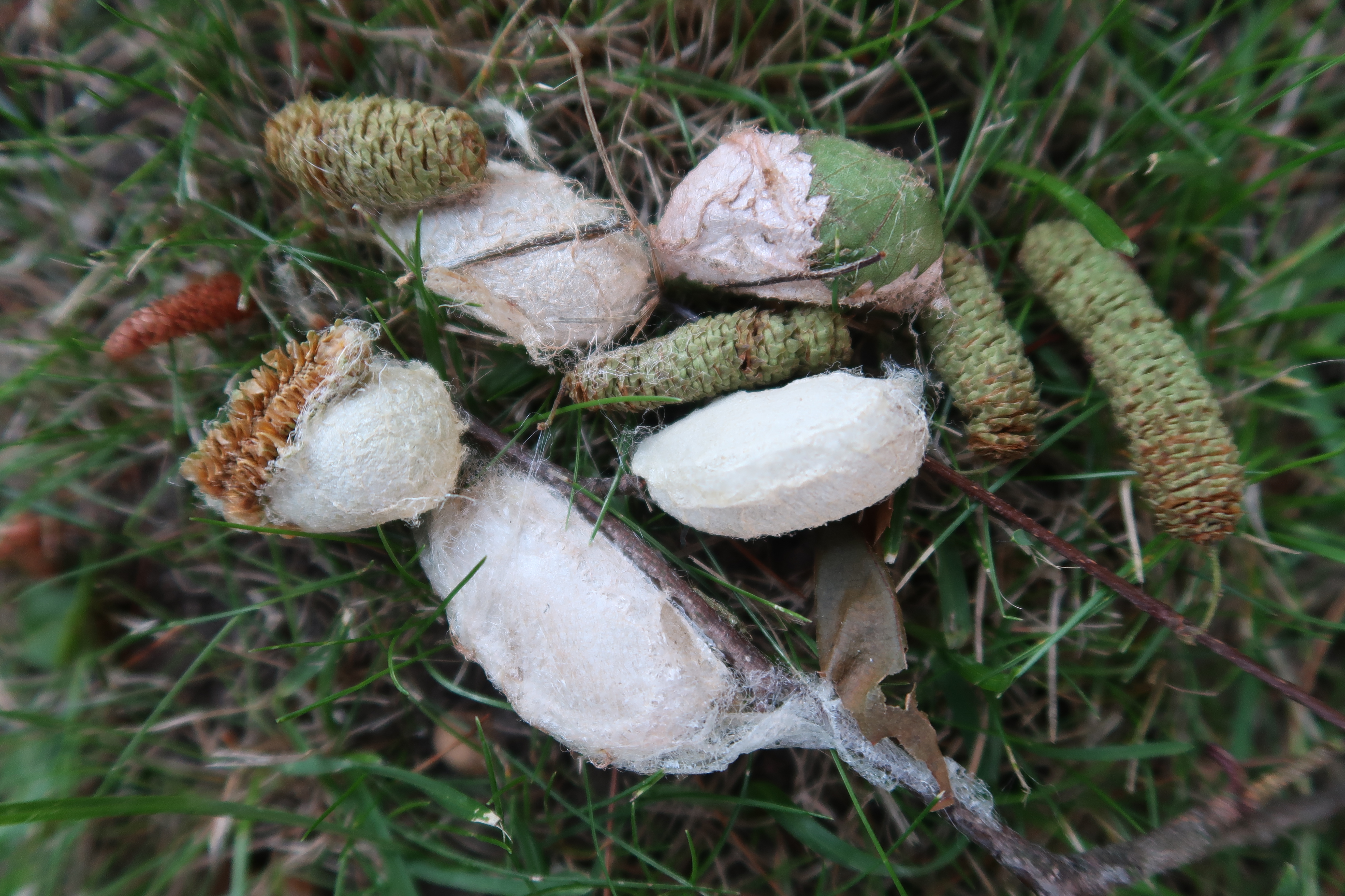 Fresh cocoons are papery and silky white, but over the span of a few days they harden and become thougher and become brownish.
