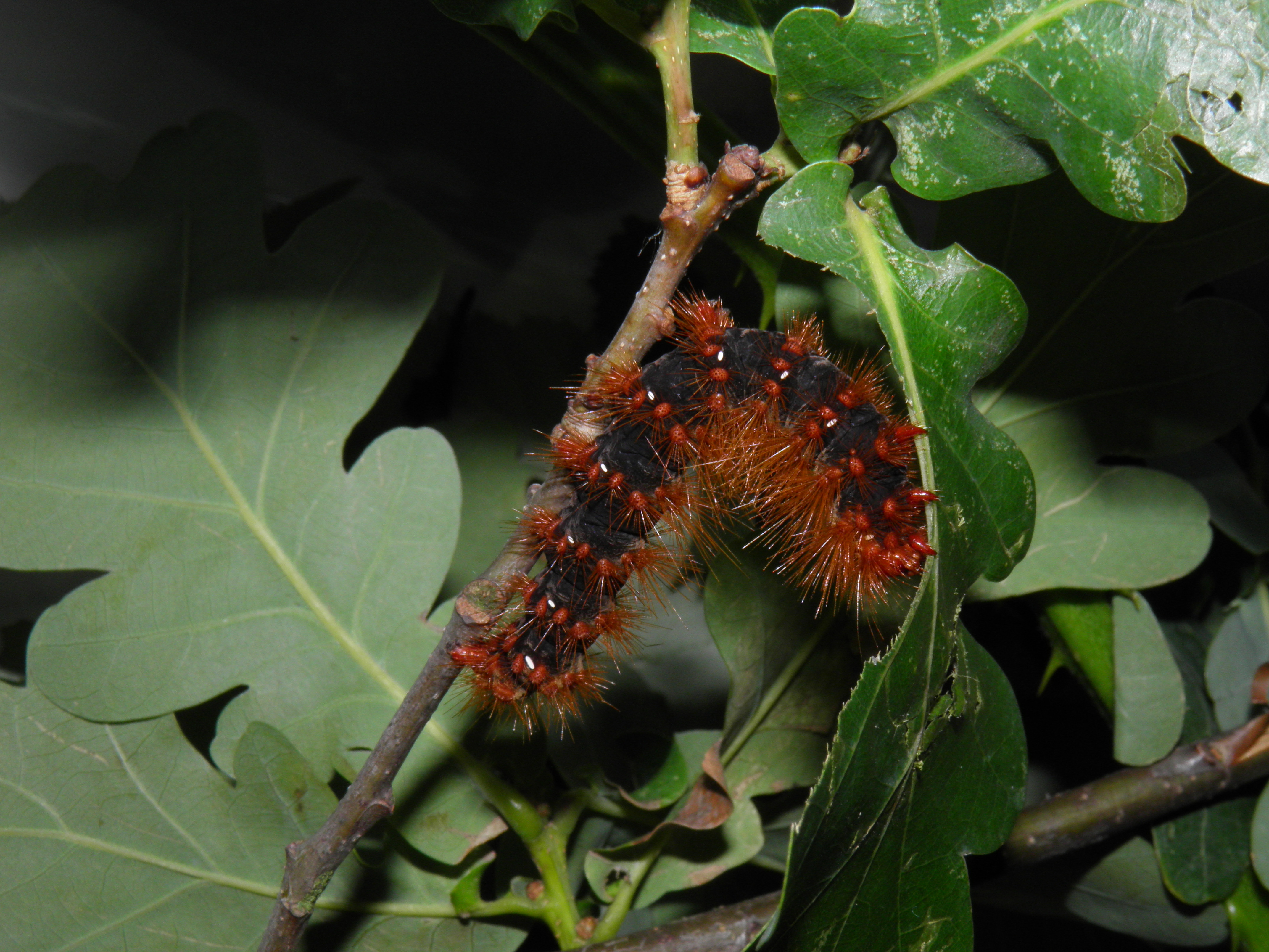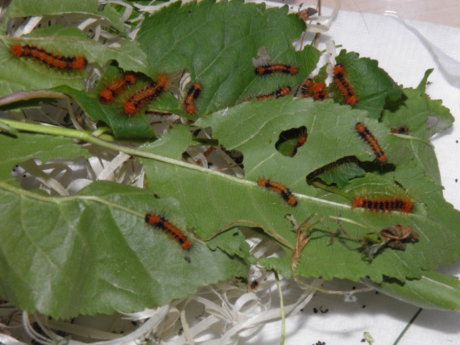 The young caterpillars can be kept in airtight plastic boxes. Although they do not need excessive ventilation, do prevent the humidity from building up, because condensation and a too high relative humidity can make them sick. The young instars are bright orange with orange bodies and black stripes on their sides and backs; the later instars have a black body with orange tufts of hair. Fully grown larvae can measure up to 8cm, or bigger in some cases.