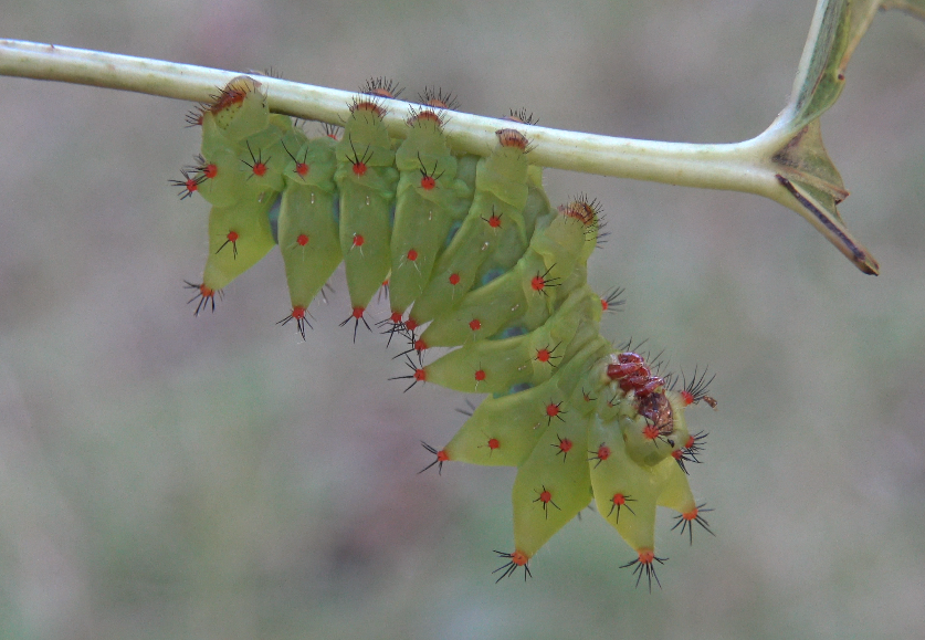 The larvae of Argema mimosae have elongated, fleshy tubercules, with a small arrangement of spines and hairs on top of them. They come in two varieties: green and (more rarely) yellow.