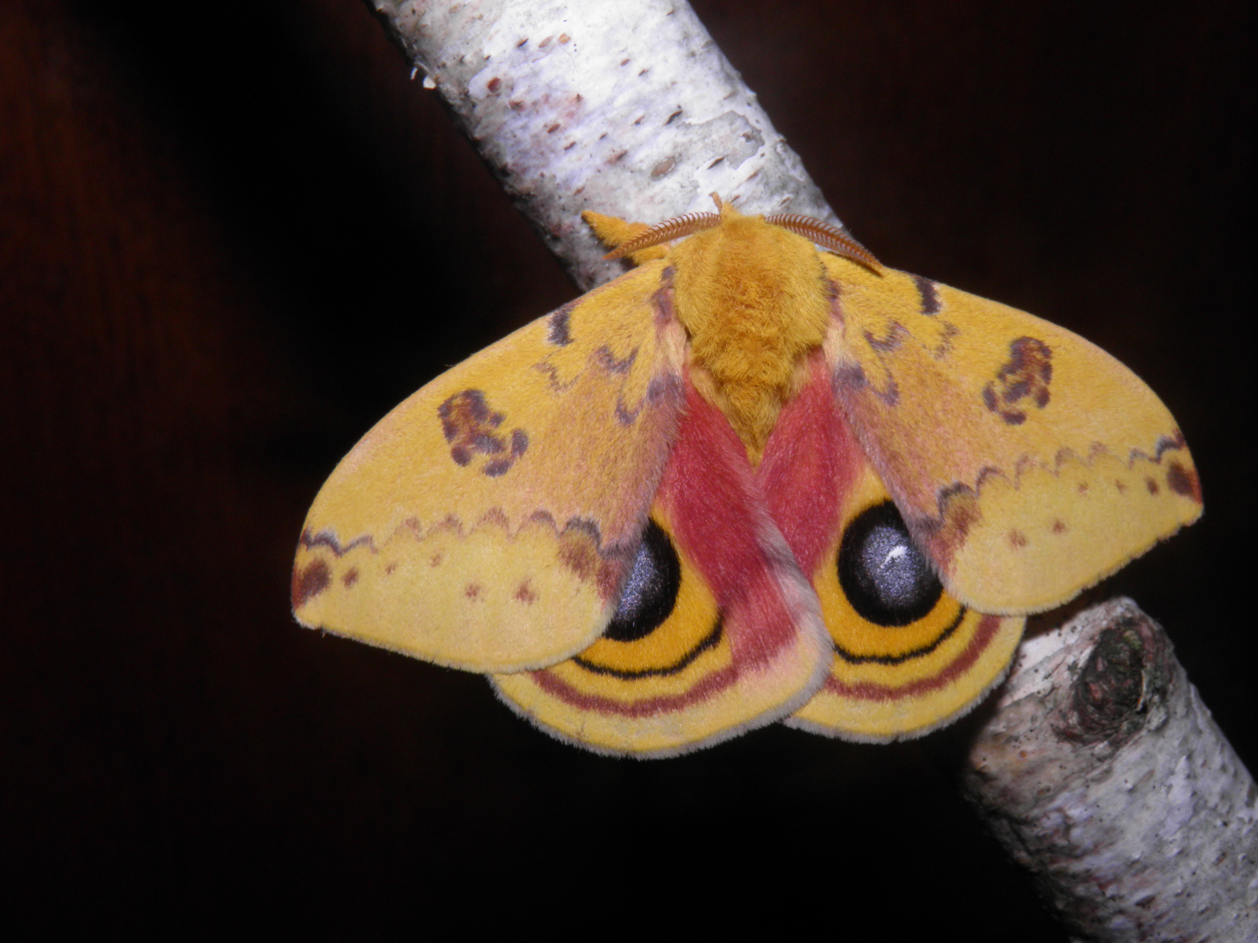 Automeris io, the io moth, is a very charming little silkmoth from America. It is found from Mexico, to most of the United States and Canada. Their most prominent feature are the brightly coloured and conspicuous eyespots on their hindwings, that give onlookers the impression they are being watched. It is also perhaps one of the most widespread and common Saturniidae species in North America because of their adaptability; Automeris io can survive in a broader range of climates and host plants. The females are brown and the males are bright yellow.