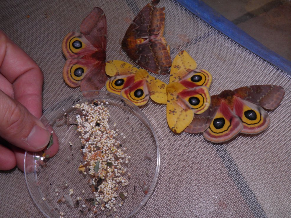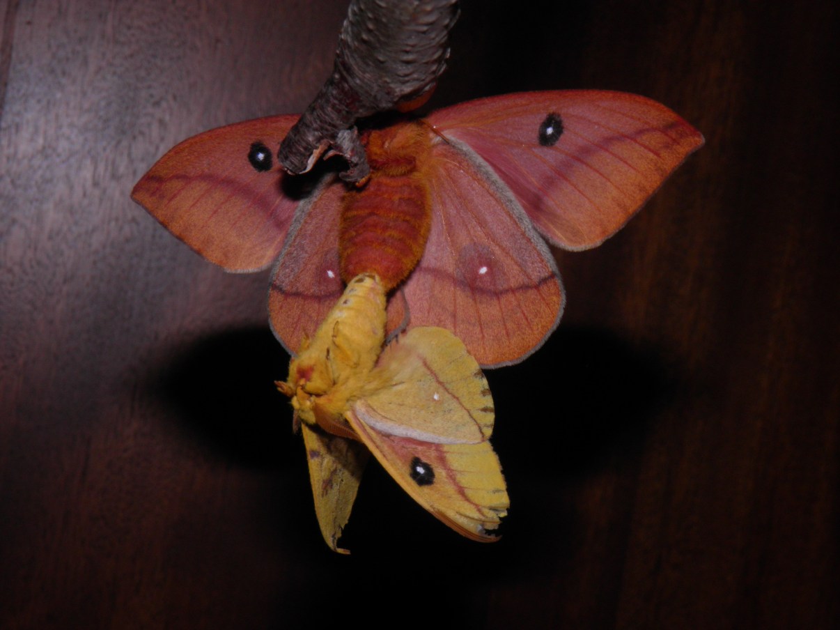 Rearing Automeris moths can be tricky, but pairing them is very easy. This genus seems to be one of the easiest to pair silkmoths in captivity. Although they can confuse breeders: most silkmoths remain attached together after copulating for 12 to 24 hours. This makes it obvious to the breeder that a pairing happened the previous night, by observing how the males and females are connected by their abdomens post-copulation.