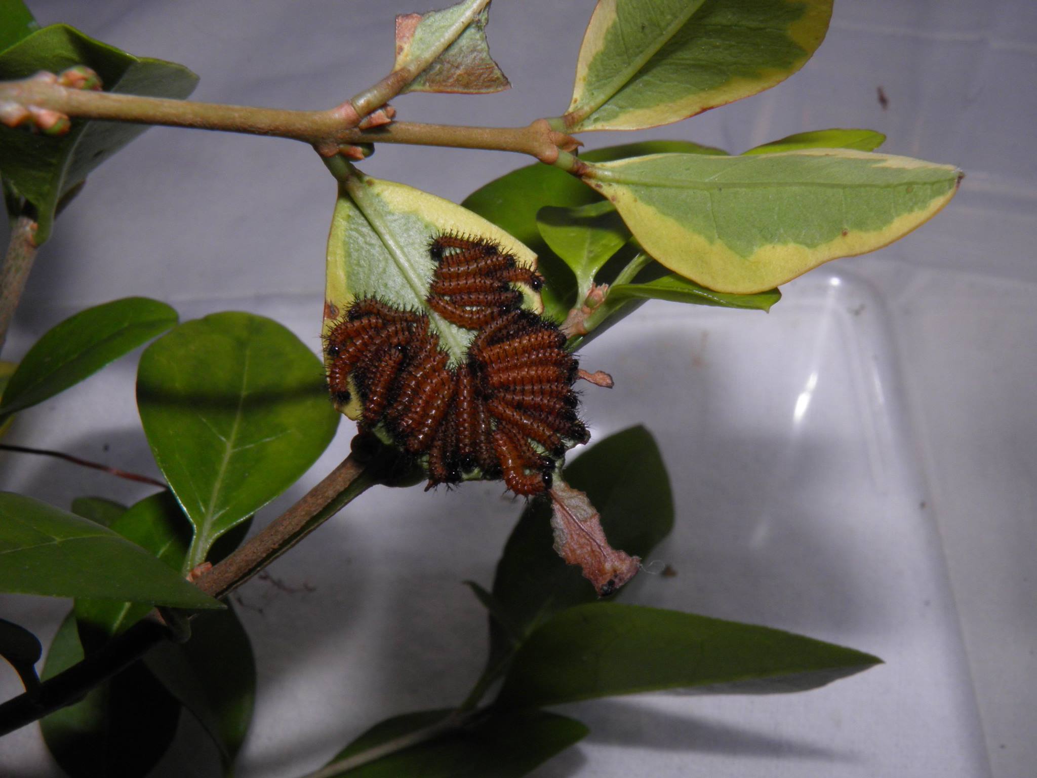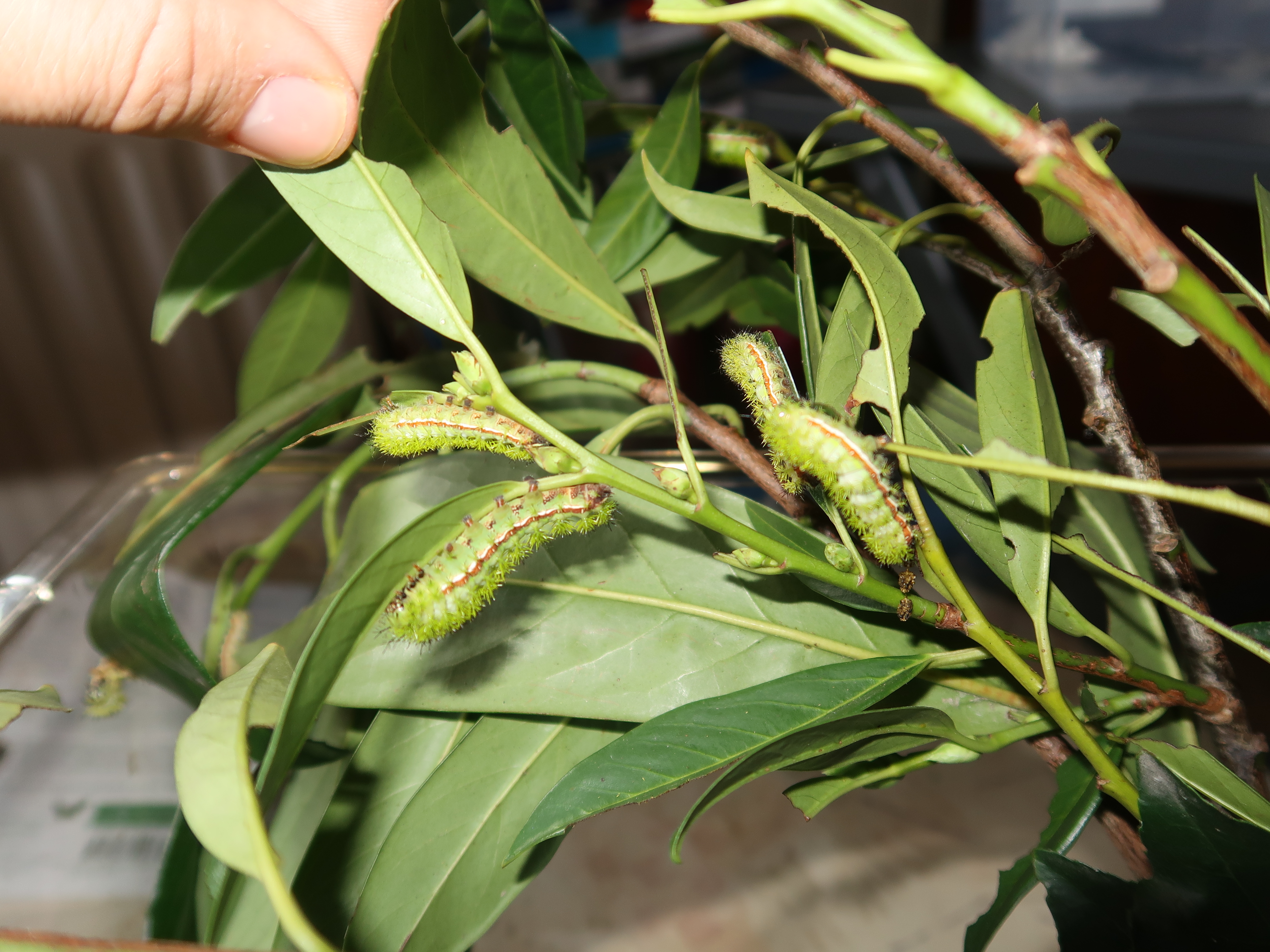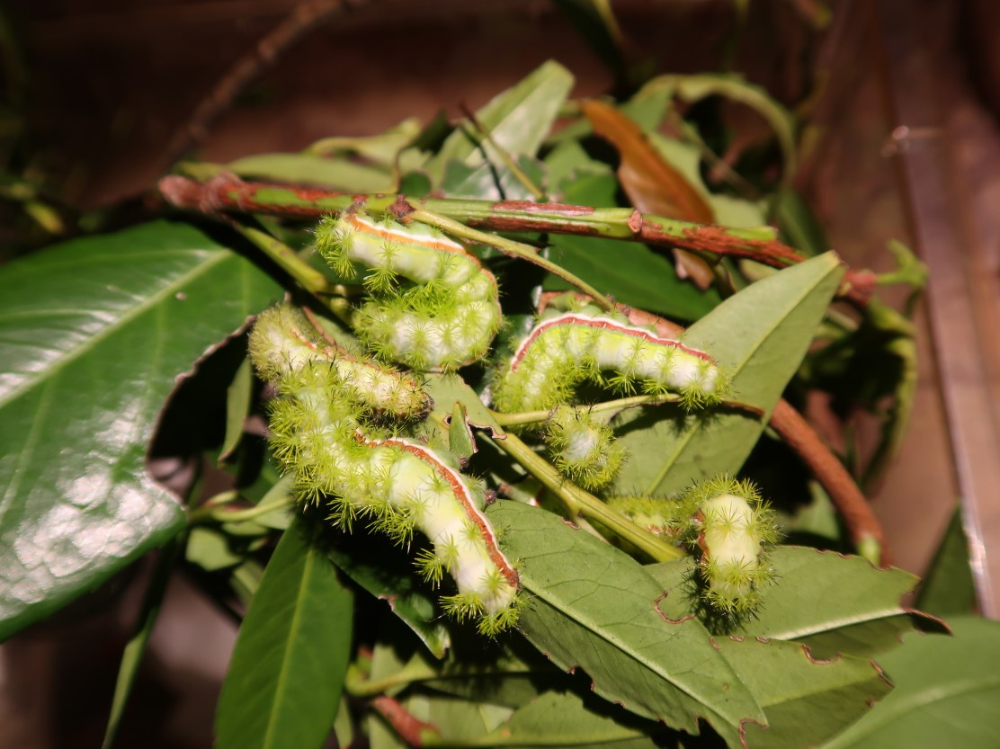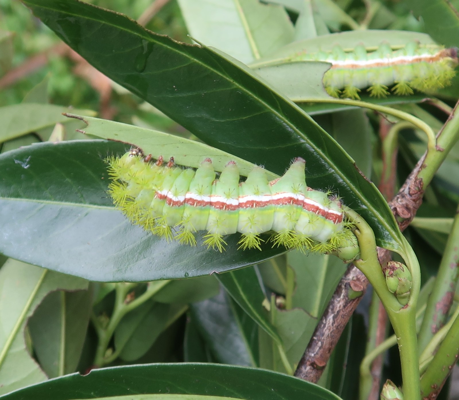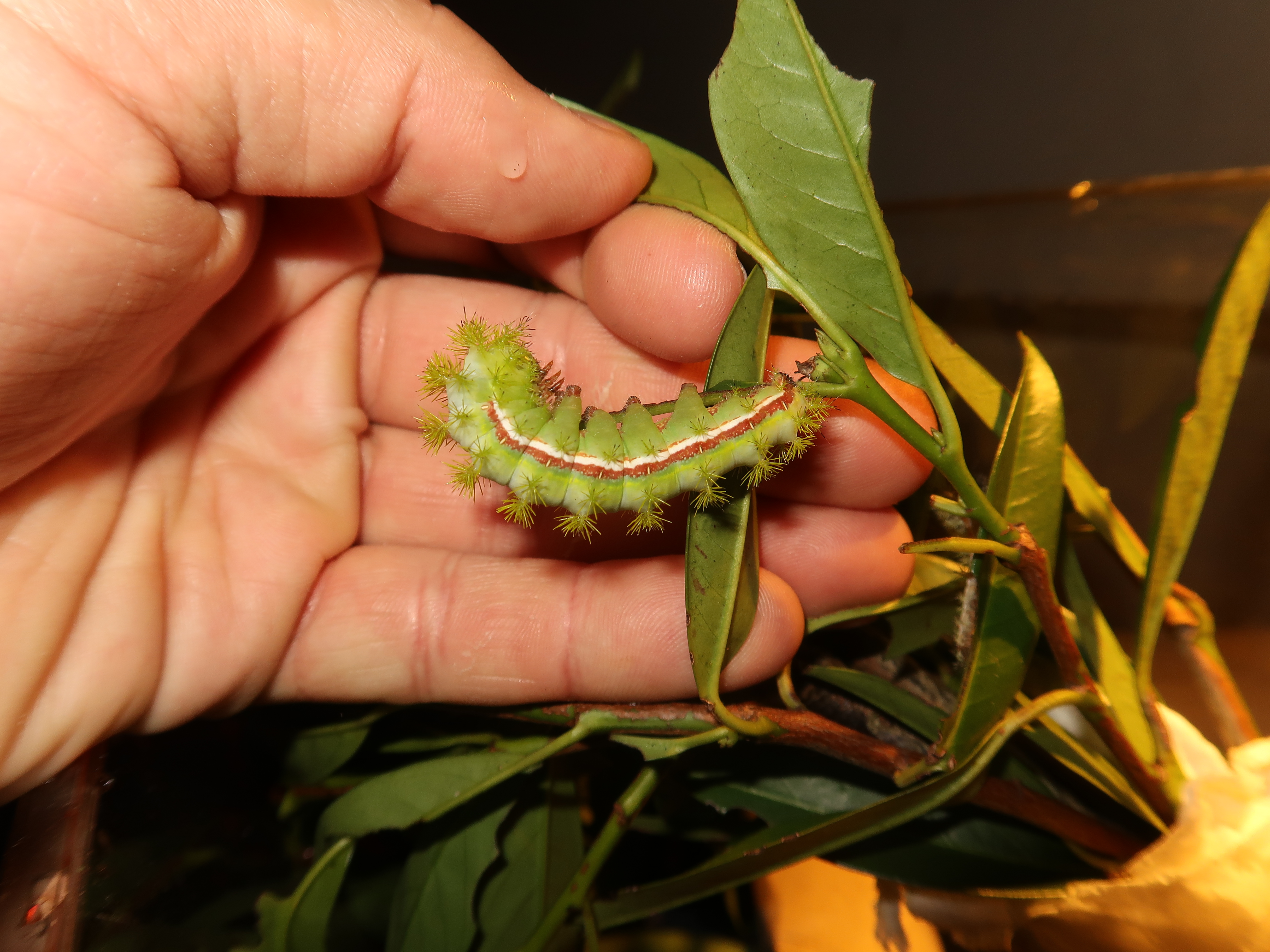 Automeris L1 on Ligustrum ovalifolium