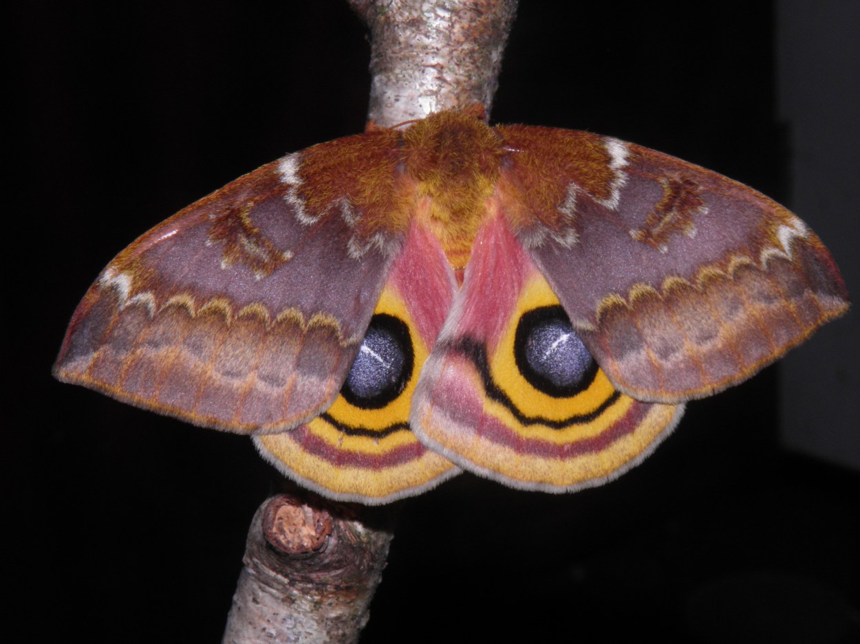 The cocoons of Automeris io do not seem to diapause in captivity if kept warm. I have succesfully bred this species in multiple generations through the year, even in winter – despite livestock coming from places like Canada, where they only have one generation per year in the wild. While they undeniably use other cues to overwinter such as day length and light intensity, it seems that no matter what, diapause is broken if they are kept warm continuously – unlike other silkmoths from North America that often need to experience a cold winter in order to break diapause (obligate diapause). The diapause of Automeris io appears to be mainly facultative.