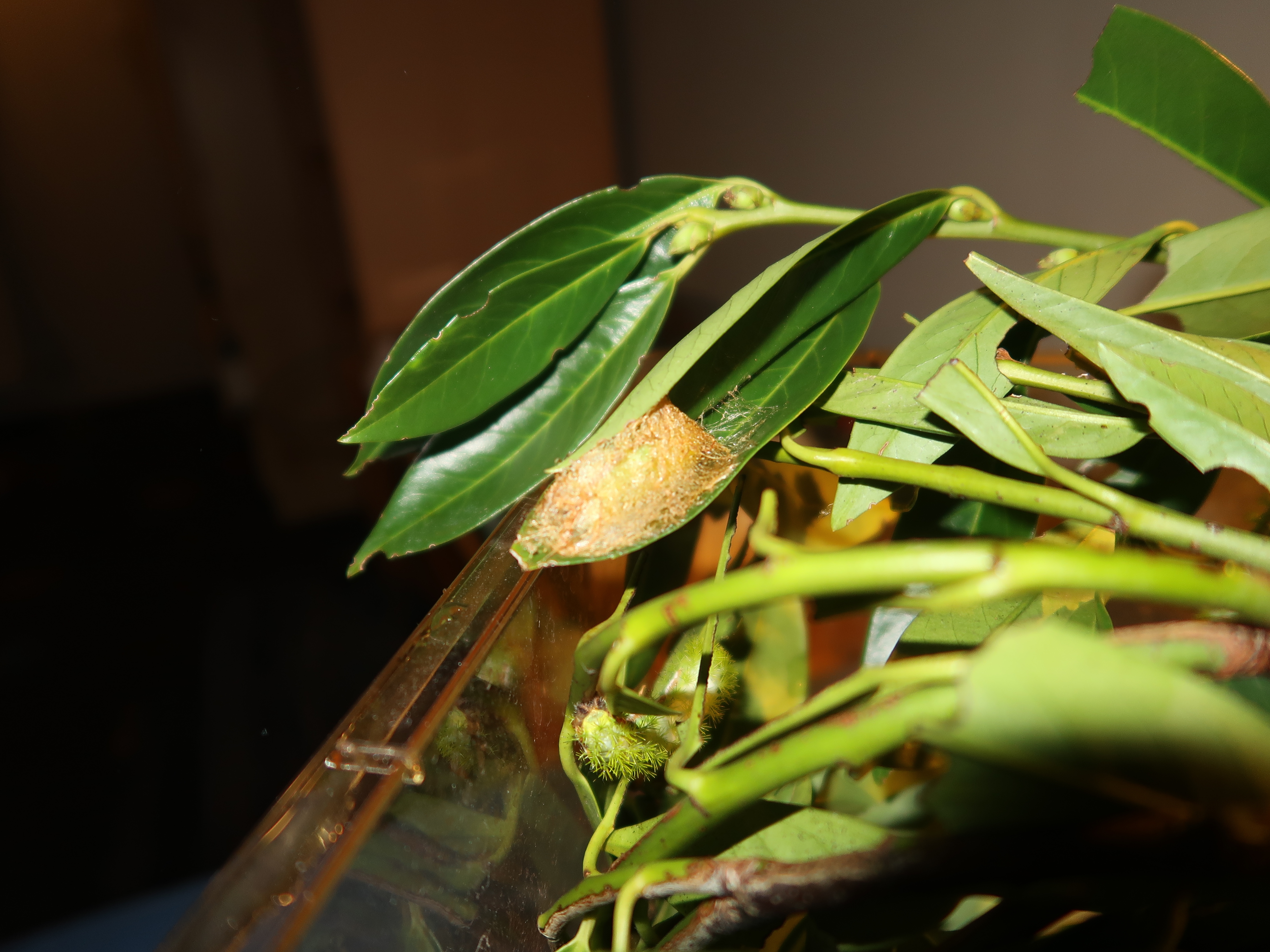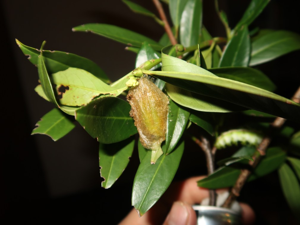 When fully grown, the larva will spin a thin papery cocoon; usually among the leaves of the food plant, or litter on the floor. Before spinning cocoons, the caterpillars will wander for a long time, up to a full day, before choosing the perfect place to make a cocoon, sometimes quite far away from the host plants. Cocoons are often recorded in leaf litter on the forest floor, on tree bark, or between the leaves of the host plant.