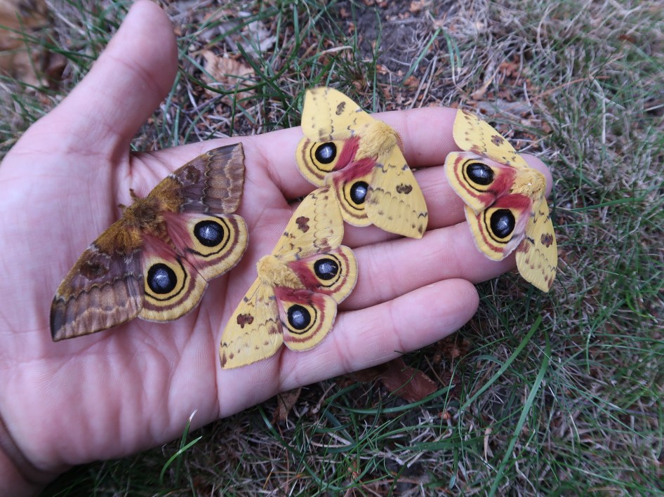 The caterpillars of Automeris io are venomous, and touching them may inflict a sting. Despite this, the sting is very mild, and not considered to be very harmful. The stinging sensation quickly dissapears after 5 to 10 minutes, leaving sore or itchy skin – it’s almost the same as a stinging nettle. The only people who should be careful with the caterpillars are people with allergies. However, the sting of Automeris io is quite mild compared to that of some tropical species of Automeris, that can be more fierce. Despite this, there is no need to cuddle or touch them (I’m a bad role model).