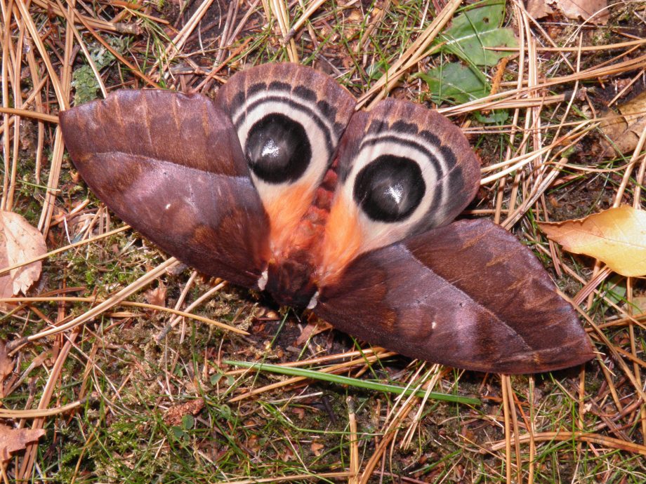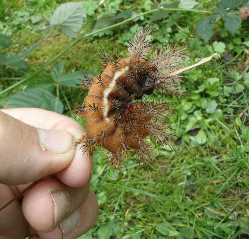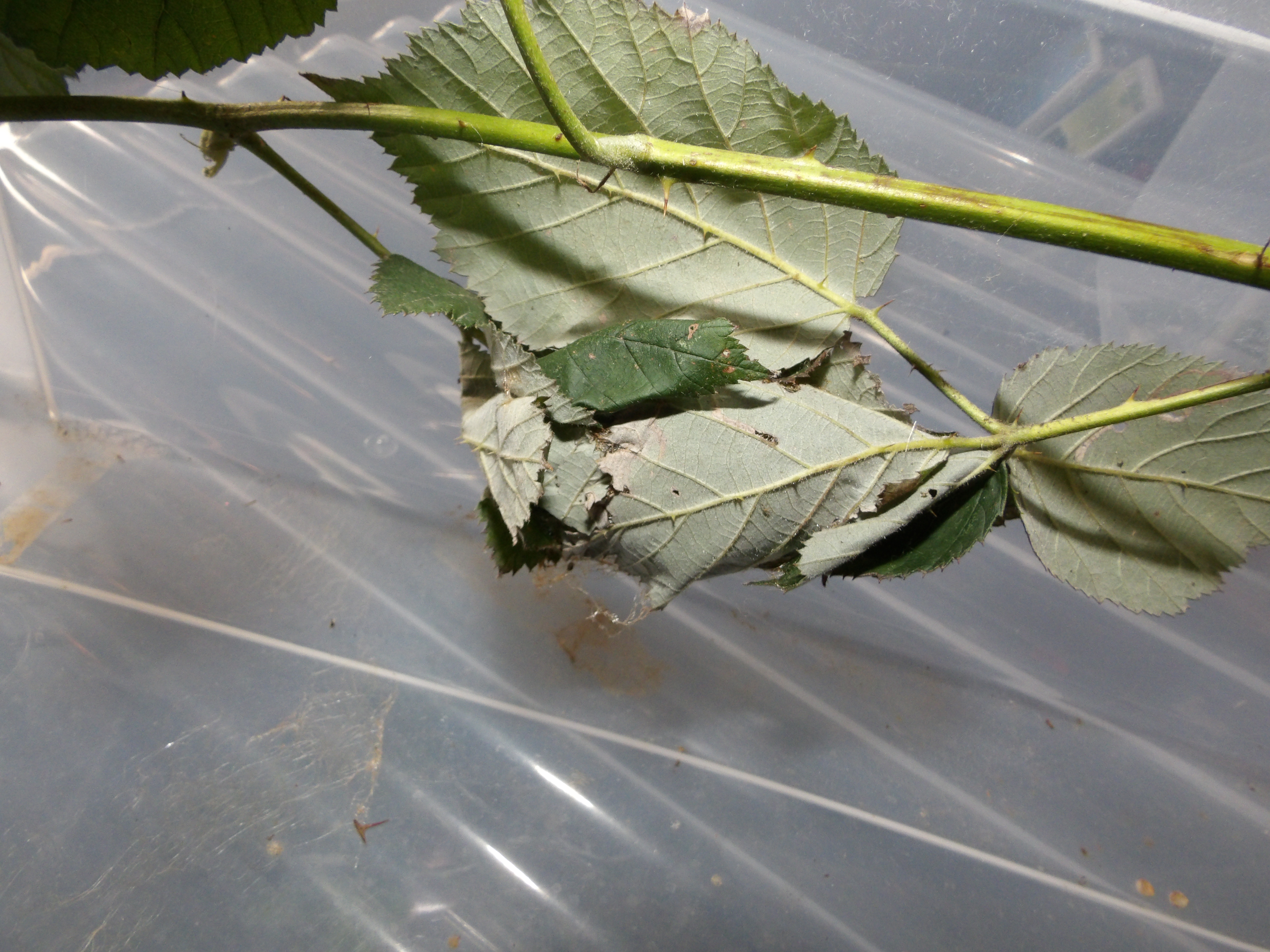 Over time, the larvae will end up looking like bigger versions of themselves – and caterpillars of this large species can grow to over 10cm in length. Before they are ready to pupate, their iridescent blue spines become grather “grey” instead of blue, and the larvae shrink in size and become chubby. It isn’t until 3-4 days later however, that they begin to spin cocoons suspended in the leaves of the food plants. If possible, they cover their cocoons entirely with leaves, although that is not always possible for them in captivity. The cocoon is thin, brown and papery. It seems their development time is quite long – it took me 2.5 to 3 months to raise them from eggs to cocoons. However, this was in the middle of winter (cold) and with what was perhaps an inferior food plant – I suspect it is possible to raise them faster in a warm room on a more nutritious plant (raspbery, oak or cherry?).