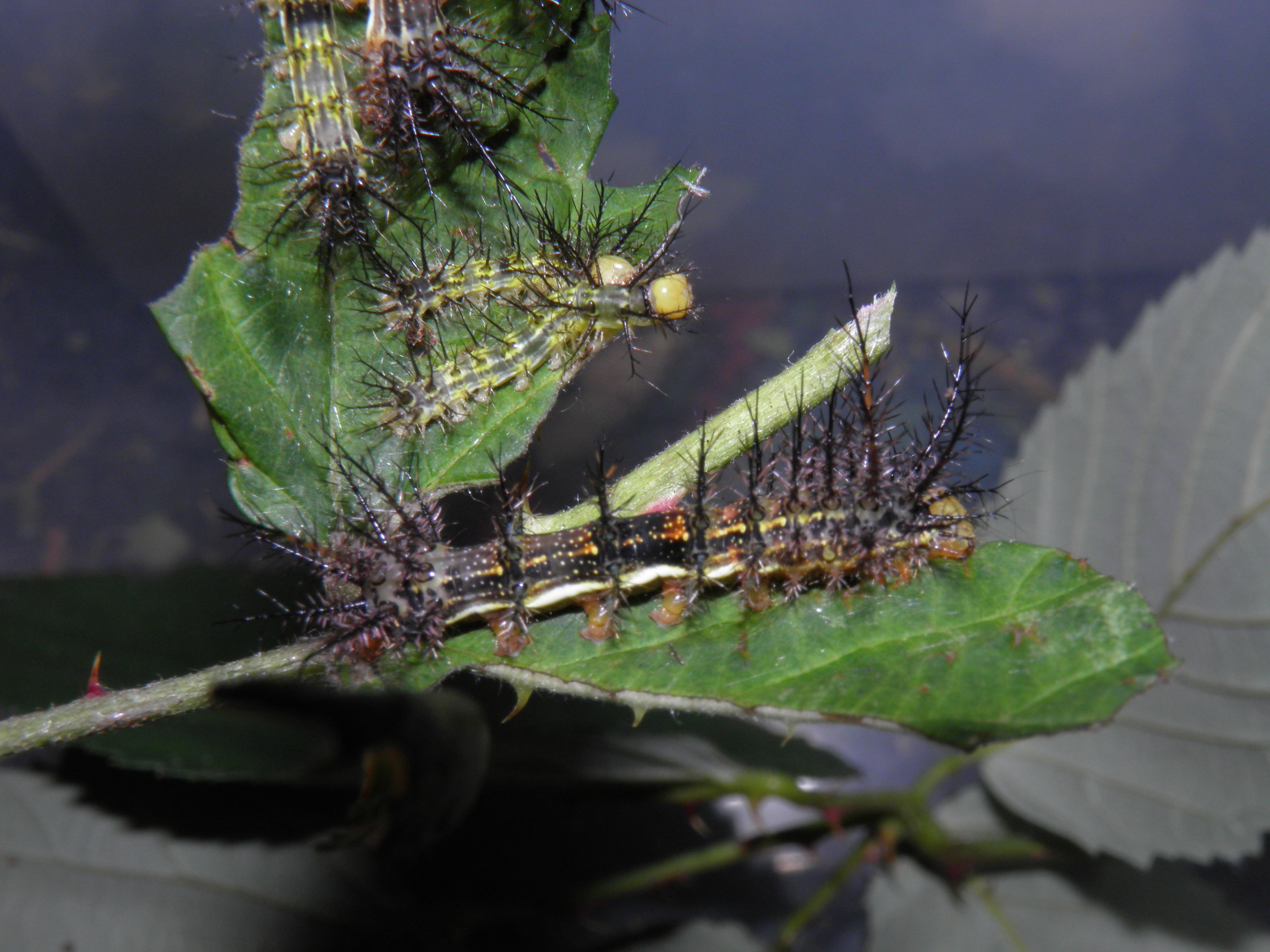 Automeris niepelti are very tolerant of humidity, and can be raised in plastic boxes from egg to cocoon. They do not need much ventilation at all, though make sure not to give them “wet” food plants or spray them if you decide to raise them in an unventilated environment. Condensation in plastic boxes is recipe for disaster (infection by viruses, fungi, bacteria and pathogens) and should be avoided – they do not need to be sprayed. The first two instars are yellow with black spikes, but the third instar becomes quite beautiful – black with accents of golden yellow and orange.