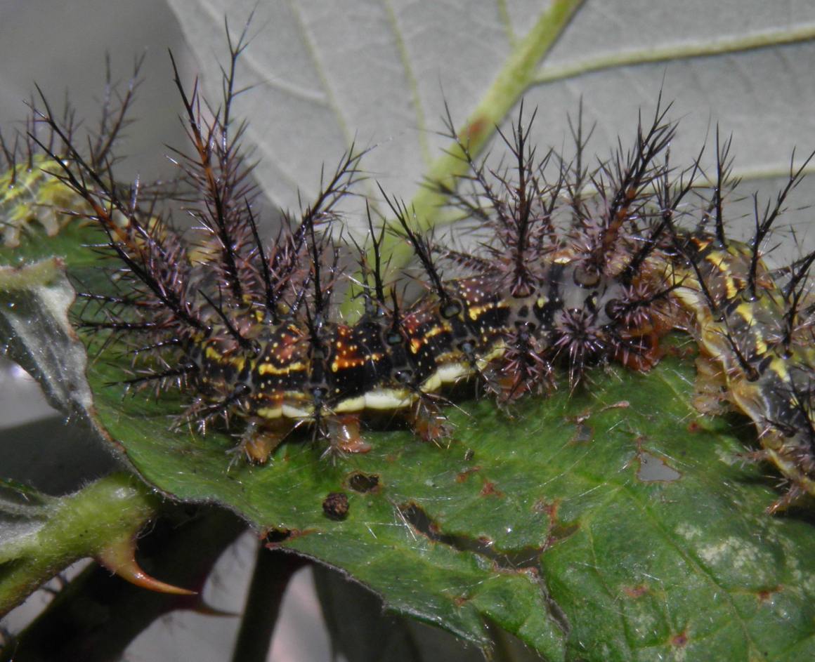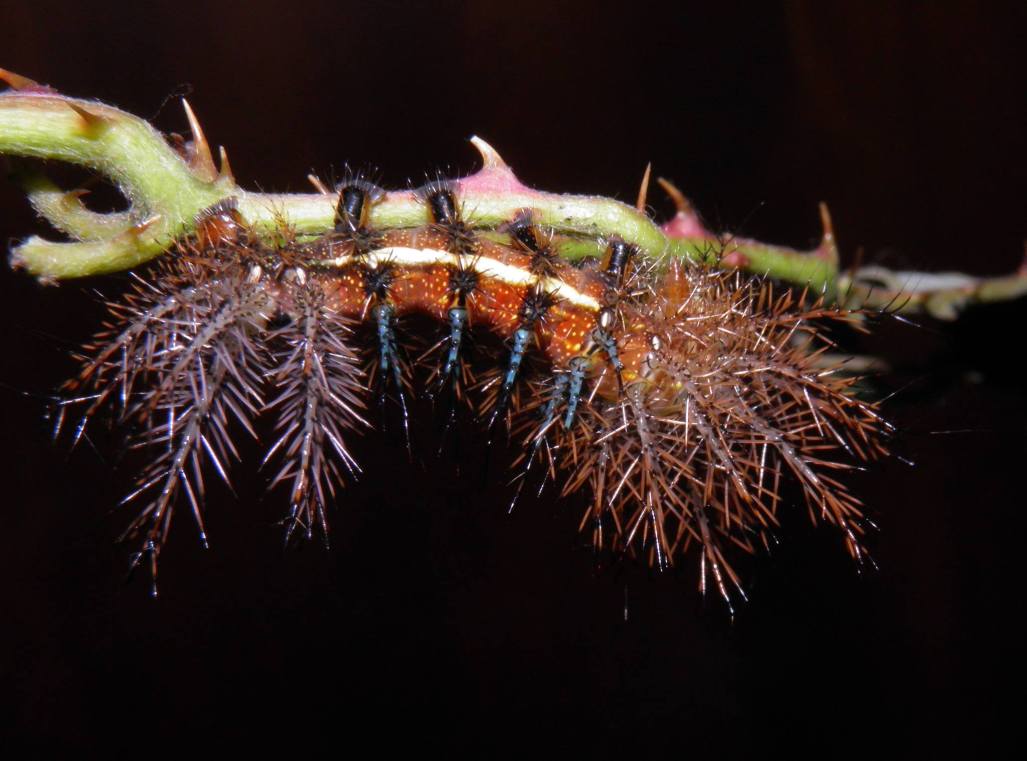The larvae of Automeris niepelti sure look impressive and very colourful – and to top it off, they have beautiful and threatening looking spines. The thorarical and rear end spines are prolonged. If molested, the larvae can curl up in a ball, protecting its head with the spines on its rear end. While not strictly dangerous, keep in mind that the sting can be painful. Allergic or sensitive people may prefer to use gloves if they are taking care of the larvae, although there is no reason to touch them unless it is by mistake – if you are a bit careful and gentle, it is easy to avoid their spines and everyone should be able to raise them without getting stung.