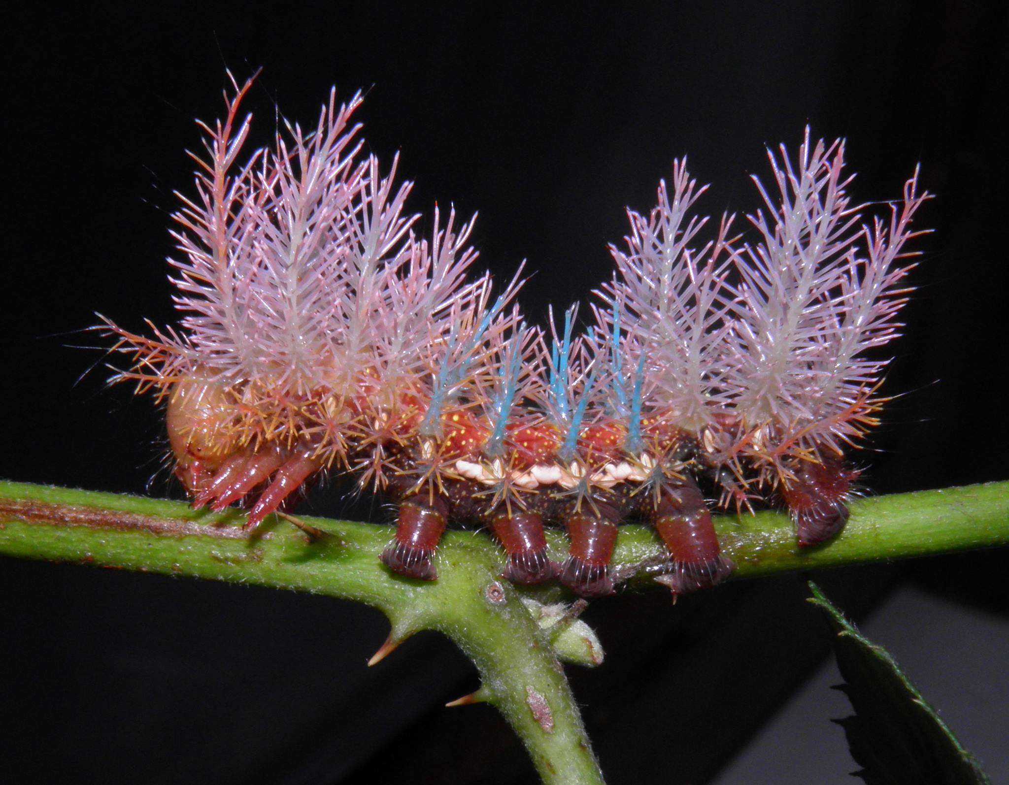 After the larvae become L4, they turn brown with iridescent blue spikes. After shedding their skin their are particulary beautiful, with pink, yellow and blue pigments (sadly, a fake photoshopped picture of Automeris larra after shedding its skin went viral – yes the larvae are pretty, but they don’t have the rainbow colours you saw online).