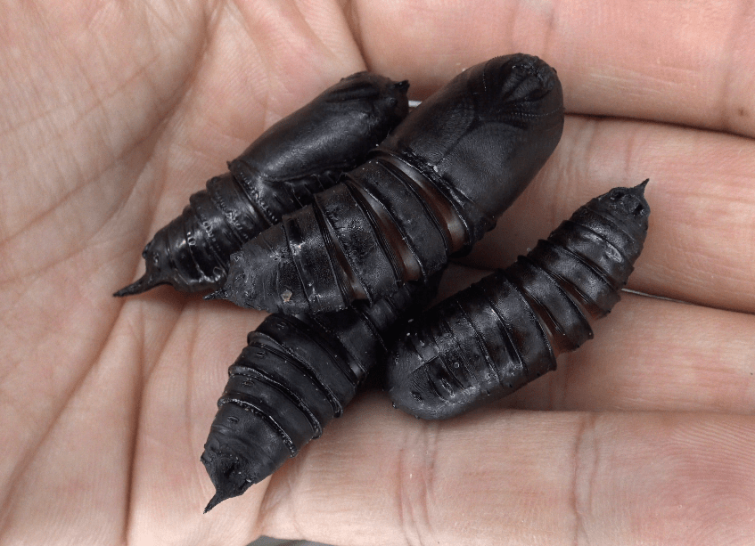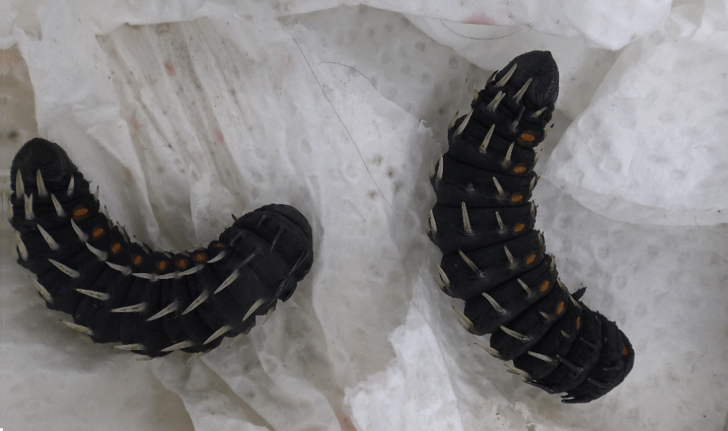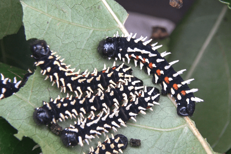 After consuming enough leaves, the larvae will shed their skin! The second instar looks quite different; usually back (or red) with white spines. The second instar can easily be raised in plastic containers with adequate space (tip: add paper towel to make it easier to clean).
