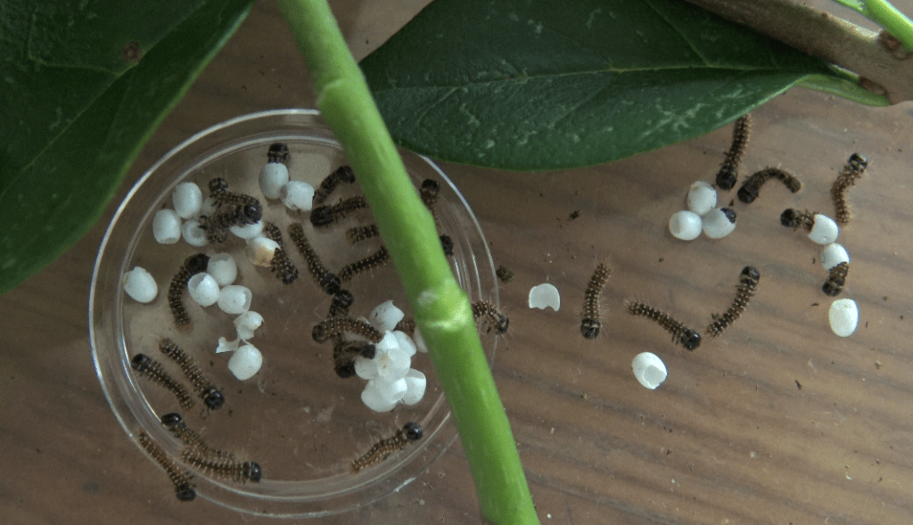 In the fourth instar, the larvae finally become somewhat solitary (although they don’t really seem to mind high densities of larvae). In this stage, I prefer to move them to a large enclosure that offers plenty of space and food plant. They can feed rapidly, and rearing a dozen or so individuals means they’ll consume a lot of food! I use large pop-up cages (make sure the indoor conditions are not too dry) or even better, plastic boxes with ventilation grids.