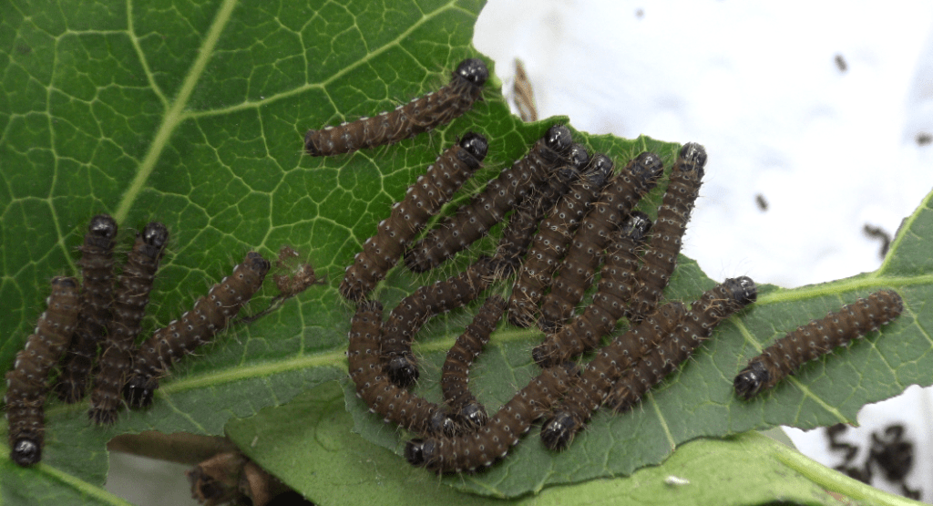 In instar 3, the larvae develop their typical look; if they’re the black form, expect black larvae with red spiracles, and white (or yellow) spines. In this stage they’re still social! So keep groups of them together.