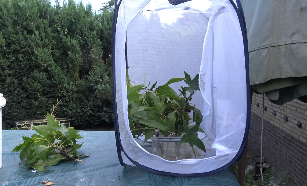 In the fourth instar, the larvae finally become somewhat solitary (although they don’t really seem to mind high densities of larvae). In this stage, I prefer to move them to a large enclosure that offers plenty of space and food plant. They can feed rapidly, and rearing a dozen or so individuals means they’ll consume a lot of food! I use large pop-up cages (make sure the indoor conditions are not too dry) or even better, plastic boxes with ventilation grids.