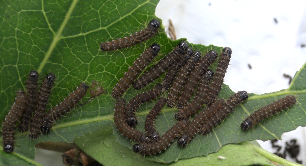 The first instars are easily raised in closed plastic boxes (it’s possible to add small ventilation holes to get rid of excess moisture); but generally they like it on the warm and humid side. After hatching, the larvae will gather in groups – the early instars of this species are gregarious. Make sure to clean the container and replace food every 3-4 days. Keep them warm; preferably above 22C.
