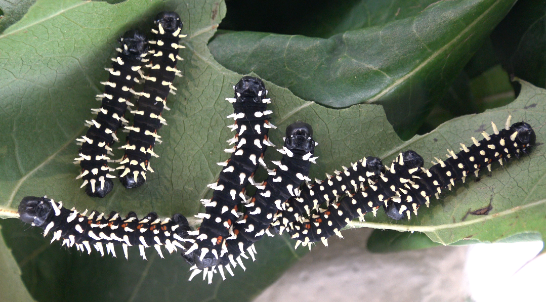 After consuming enough leaves, the larvae will shed their skin! The second instar looks quite different; usually back (or red) with white spines. The second instar can easily be raised in plastic containers with adequate space (tip: add paper towel to make it easier to clean).