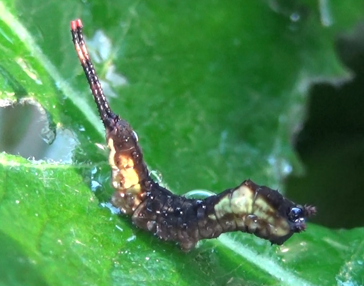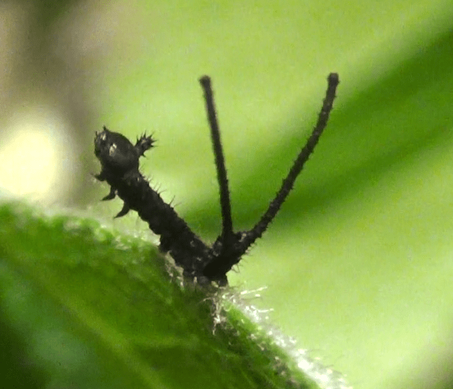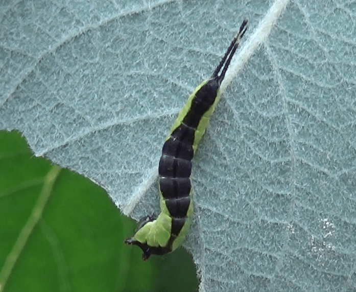 Most notable about this species are their larvae. Their terminal prolegs have been modified into tail-like appendages (flagellae), the tips of which they can extend even further by protruding two whip-like tentacles that can wiggle wildly when they feel threatened.