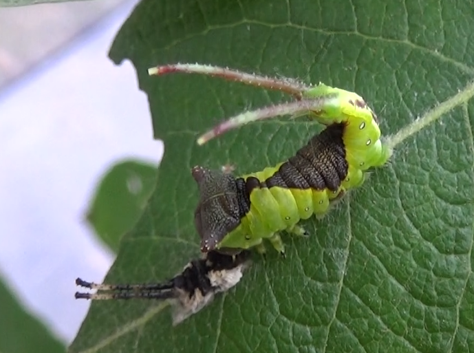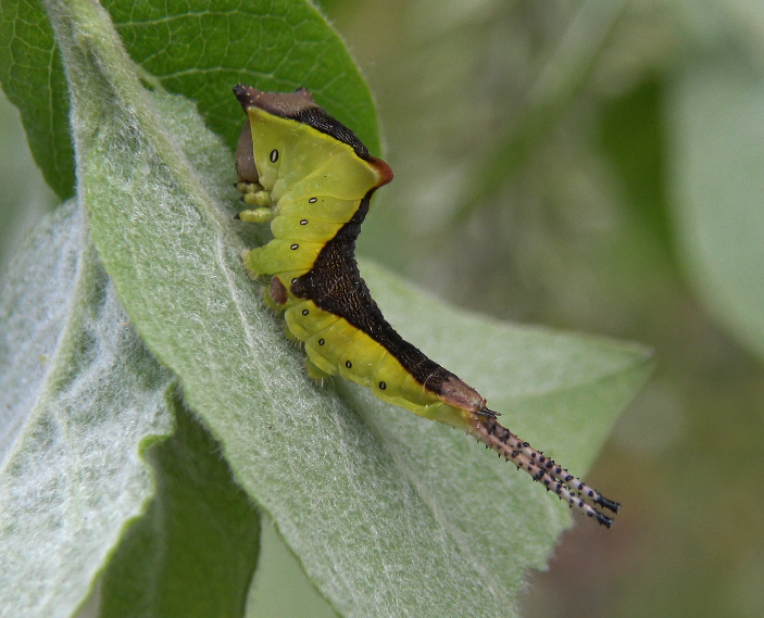 Caterpillars of the genus Cerura (but also their relatives such as the genus Furcula, Neoharpyia, etc.) have a very distinct look! Their last pair of prolegs is heavily modified into two flagellae – tentacle like appeandages or tails. These are used to distract predators away from their vital body parts.
