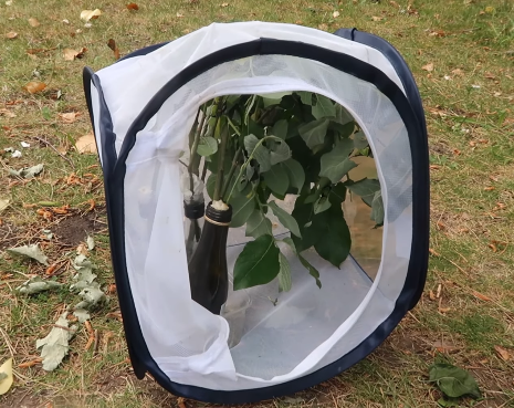 Usually larvae grow well indoors; but make sure the environment is not too dry (indoors is very dry!). However, they can also be reared all the way through to the cocoon stage in plastic containers. If you decide to use plastic containers, use generously large boxes, and cut a modest amount of ventilation holes in them. If you decide to use cages, buy pop-up cages for pet insects online. Cut some food plant (Salix, Populus) and place it in a bottle filled with water; it will keep the plant fresh. The caterpillars will roam freely on the plant and consume the leaves.