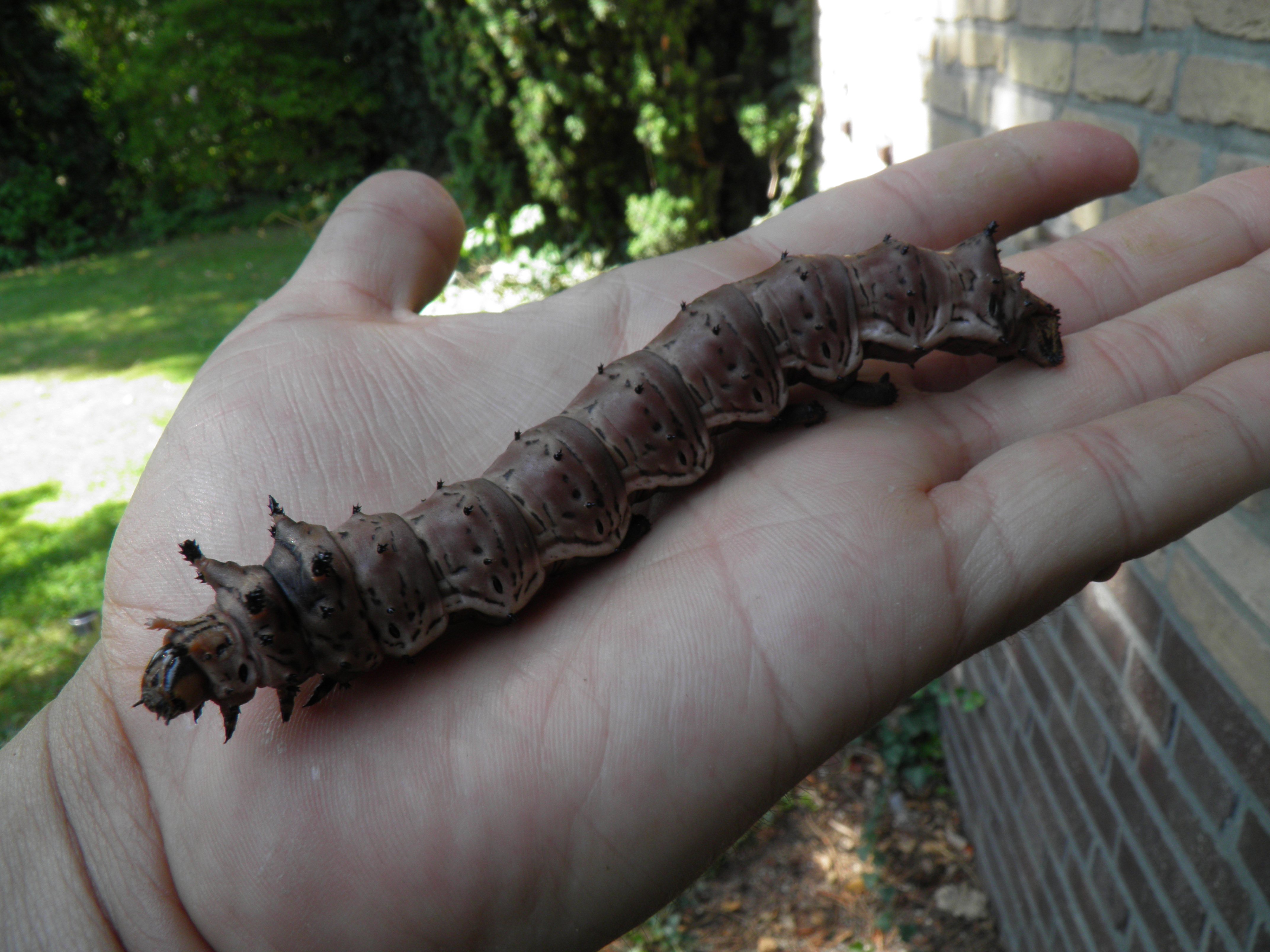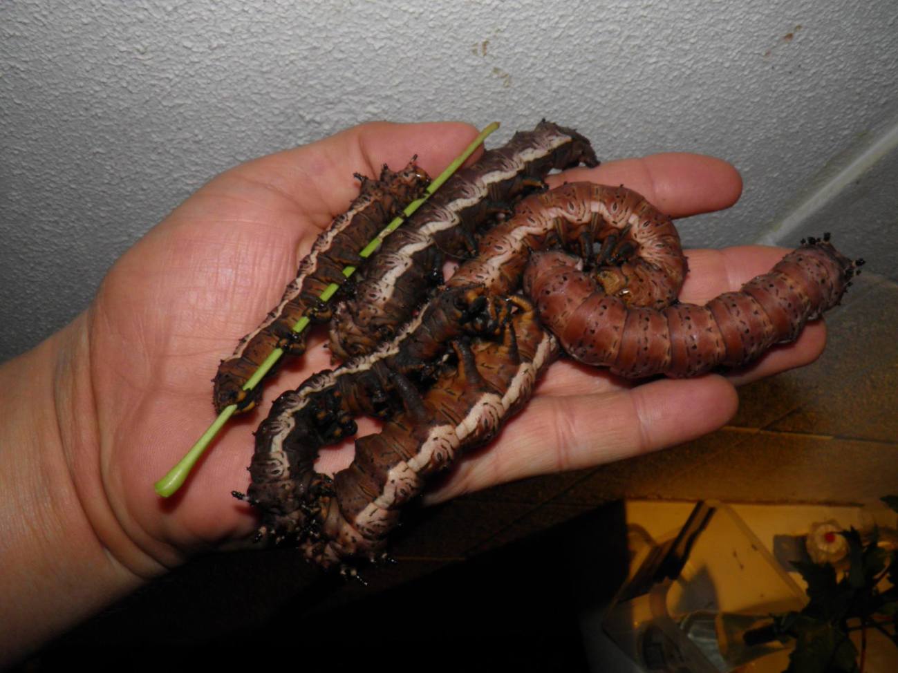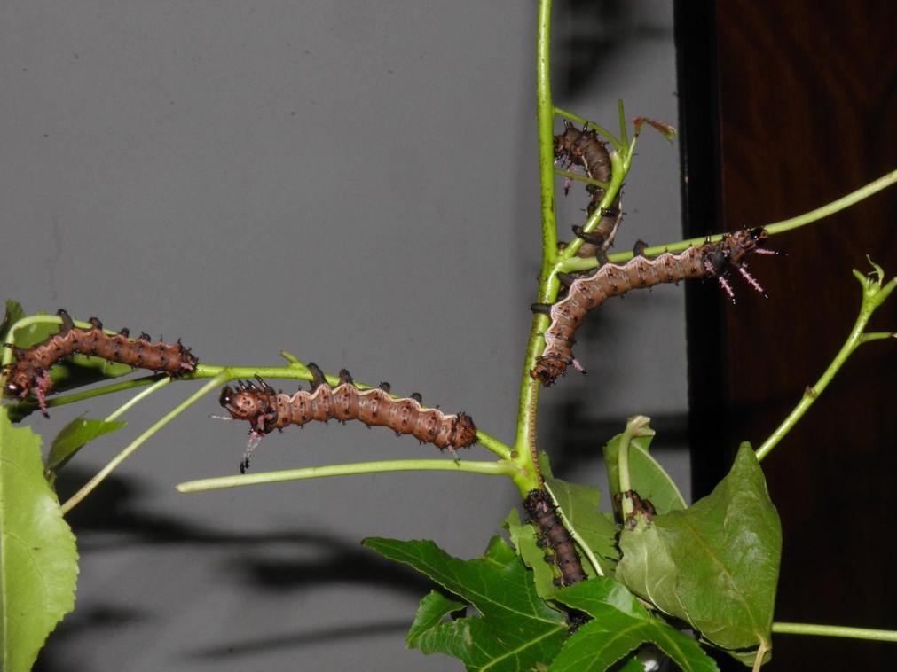 In the fourth instar, caterpillars become quite large, with smaller and reduced horns on thier bodies. Their base colour is dark to chocolate brown, with lighter markers on their sides.