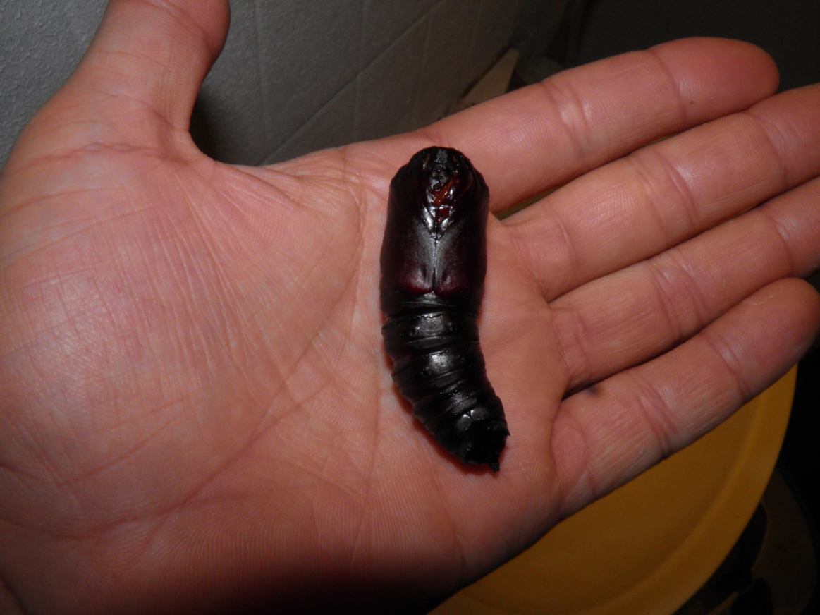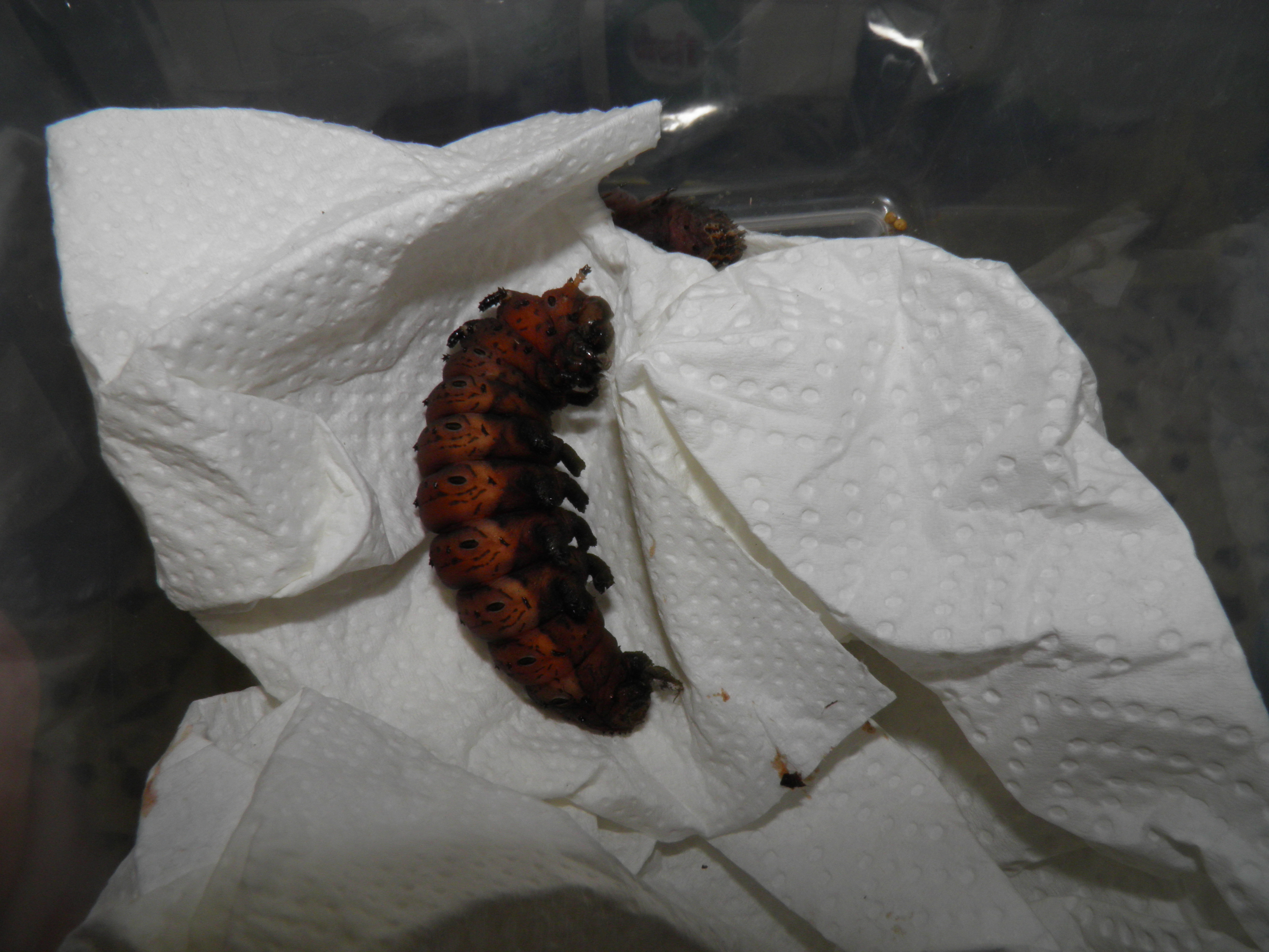 Pupation happens underground. In the wild, larvae burrow in the earth and form a pupa here in a subterranean chamber. In captivity you can substitute the soil for something else like vermiculite, bird sand, or if you’re lazy like me, paper tissue towels. Here they lie for a while as prepupal larvae, before shedding their old skin and pupating.
