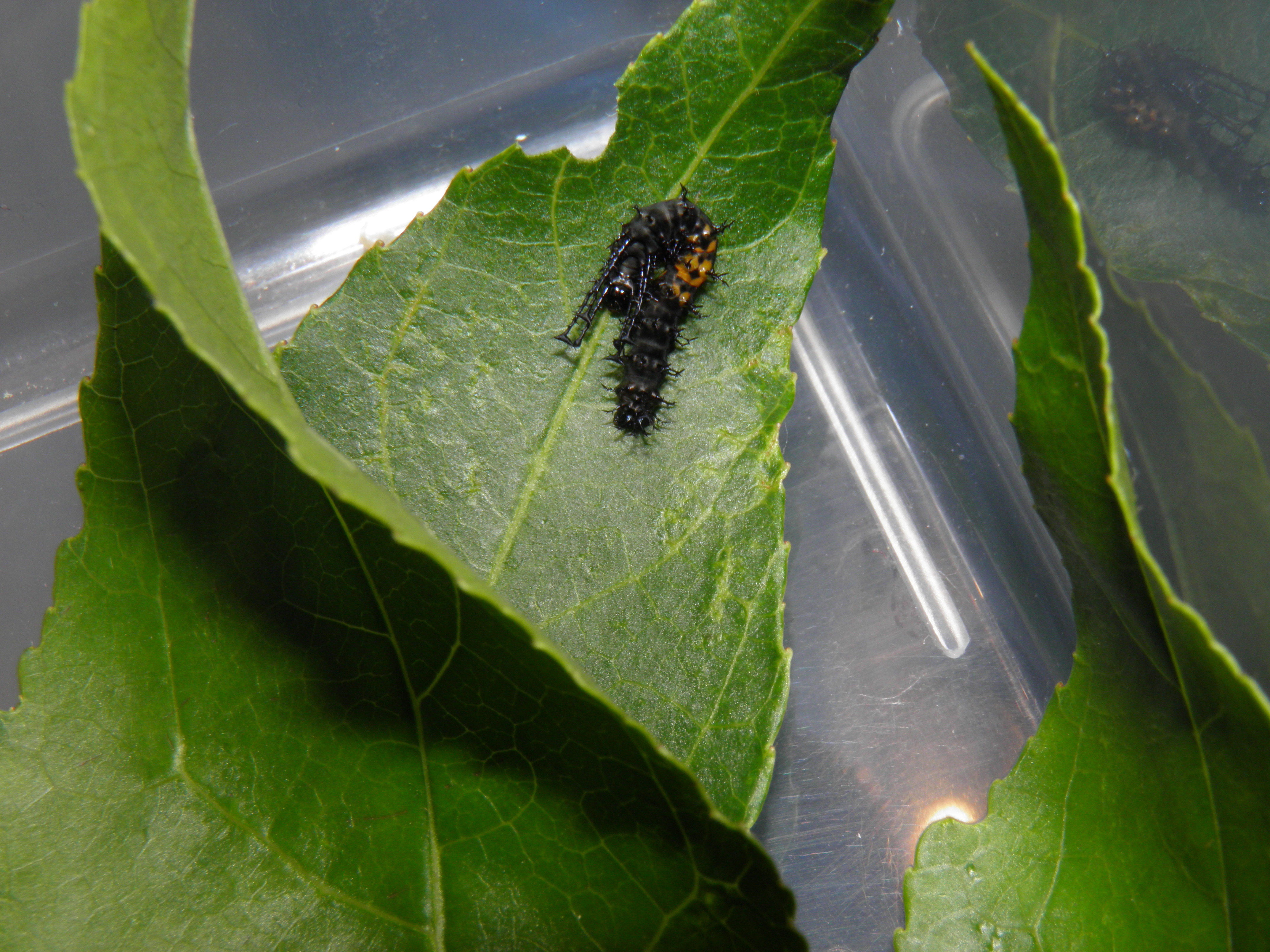 Young hatchlings are black, with an orange patch in the middle on the segments located below the thorax and thoracic horns. They can be kept in plastic boxes up until the third instar. Later instars however, really need ventilation and fresh air to prevent infections and diseases. The first two instars last relatively short, and the caterpillars will shed to the third instar in no time. Second instar caterpillars look like a larger version of the first instar with more highly developed and pronounced horns on their bodies.